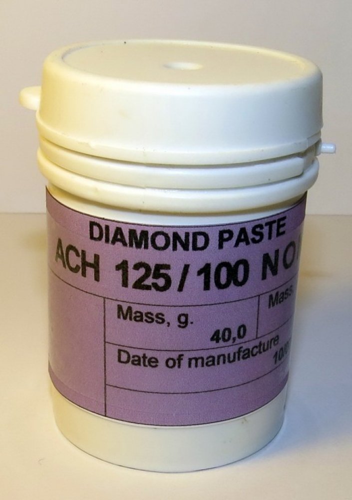 Zrnitost diamantové pasty: 125/100; 100/80; 80/63; 60/40; 40/28; 28/20; 20/14; 14/10; 10/7; 7/5; 5/3; 3/2; 2/1; 1/0; 0,5/0