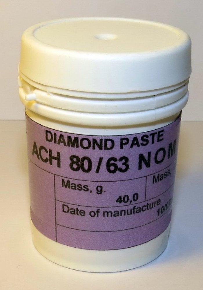 Zrnitost diamantové pasty: 125/100; 100/80; 80/63; 60/40; 40/28; 28/20; 20/14; 14/10; 10/7; 7/5; 5/3; 3/2; 2/1; 1/0; 0,5/0