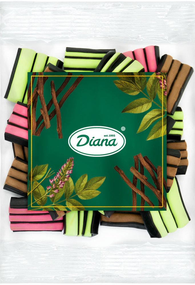 Diana Company Lékořice ovocný mix 100 g Hlavní struktura lékořice je tvořena pšeničnou moukou, která je pro získání tradiční chuti doplněna o další ingredience jako například cukr a melasa. Špetka Anýzového oleje se pak přidá k celkovému zintenzivnění lékořicové chuti.