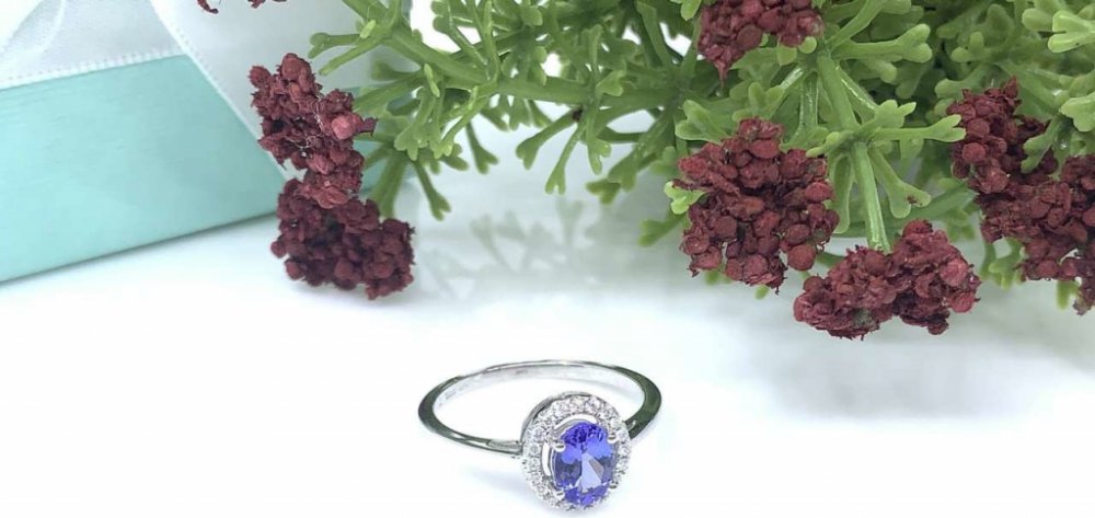 Dámský prsten bílé zlato - 1x tanzanit, 7x5mm, 20x briliant G-H/Si 0,115ct, velikost prstenu: 57