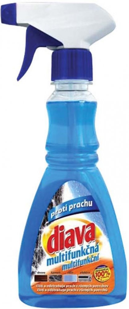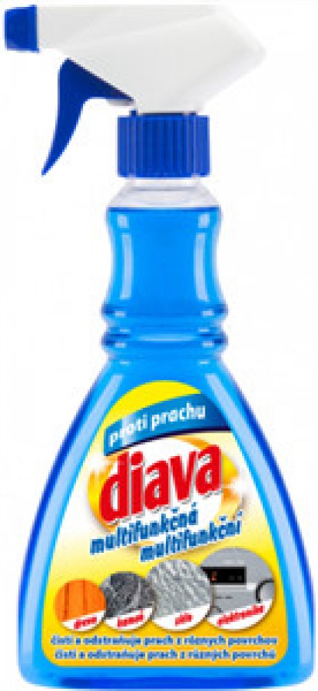 DIAVA multifunkční přípravek v rozprašovači proti prachu. Použitelný na kov, sklo, dřevo, elektroniku (kromě plazmových a LCD obrazovek). Lehce a bez námahy leští všechny druhy povrchů ve vaší domácnosti. S příjemnou vůní a obsahem antistatických složek.