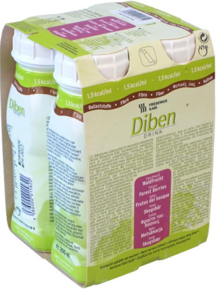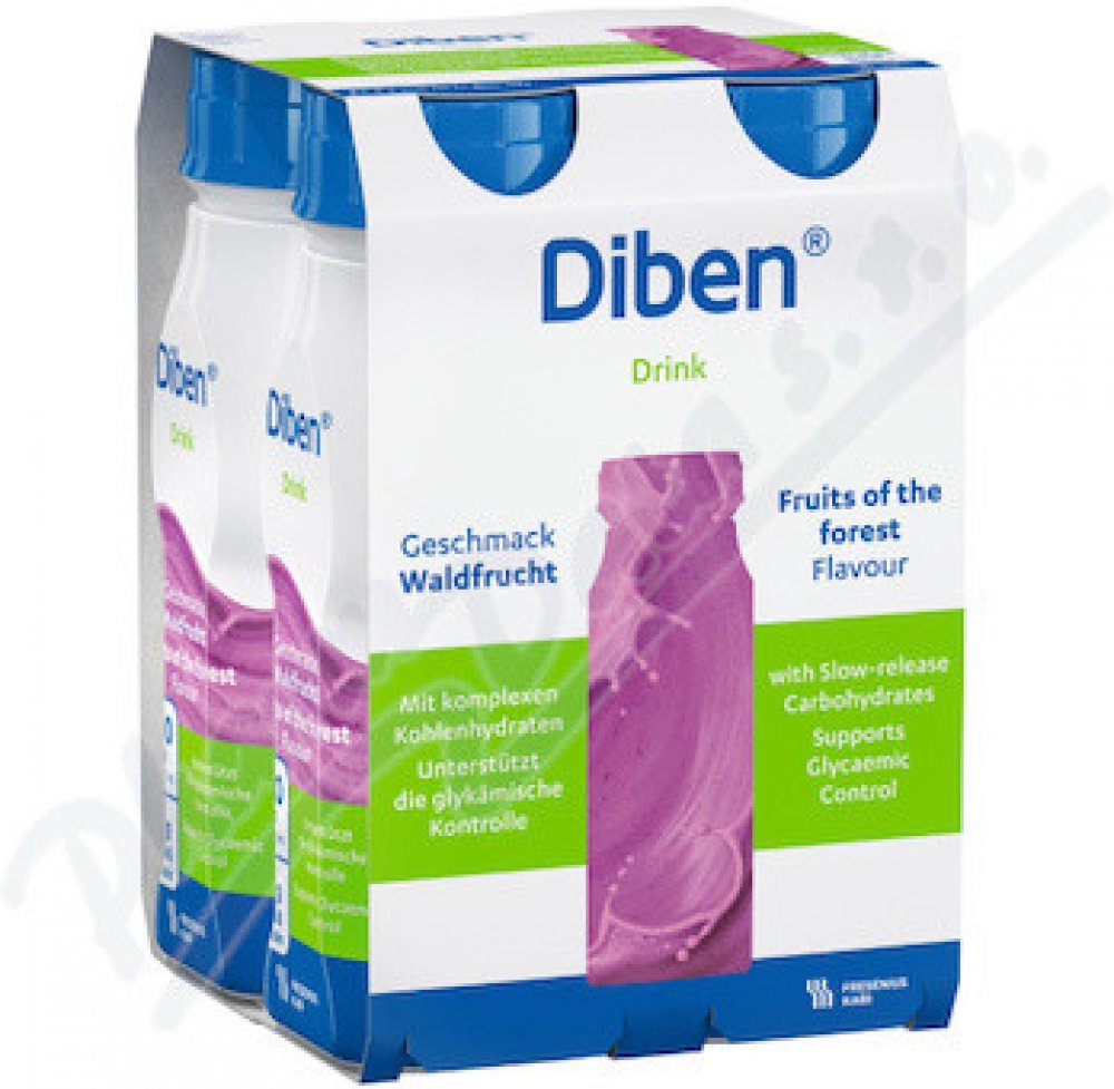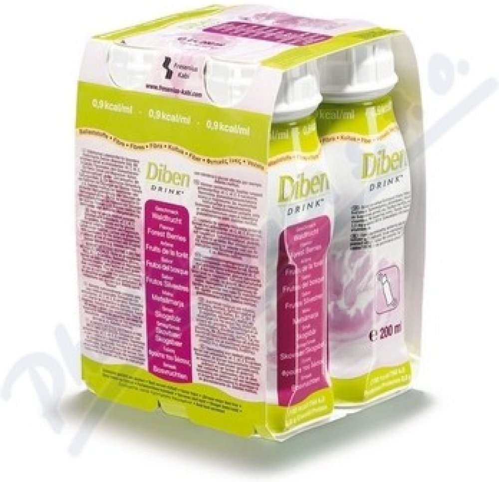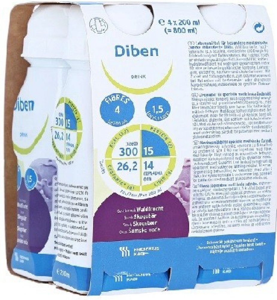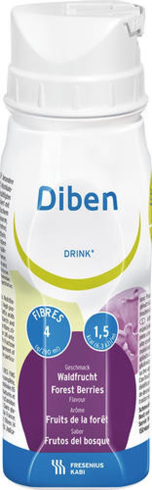 Diben DRINK je tekutá výživa k popíjení při poruchách glykémie a cukrovce. Má vysoký obsah energie 300 kcal v jedné lahvičce 200 ml a obsah bílkovin 15 g. Obsahuje cukry vhodné pro diabetiky, chrom a omega 3 mastné kyseliny. Je vhodný při poruše glukózové tolerance a při diabetu I. a II. typu.