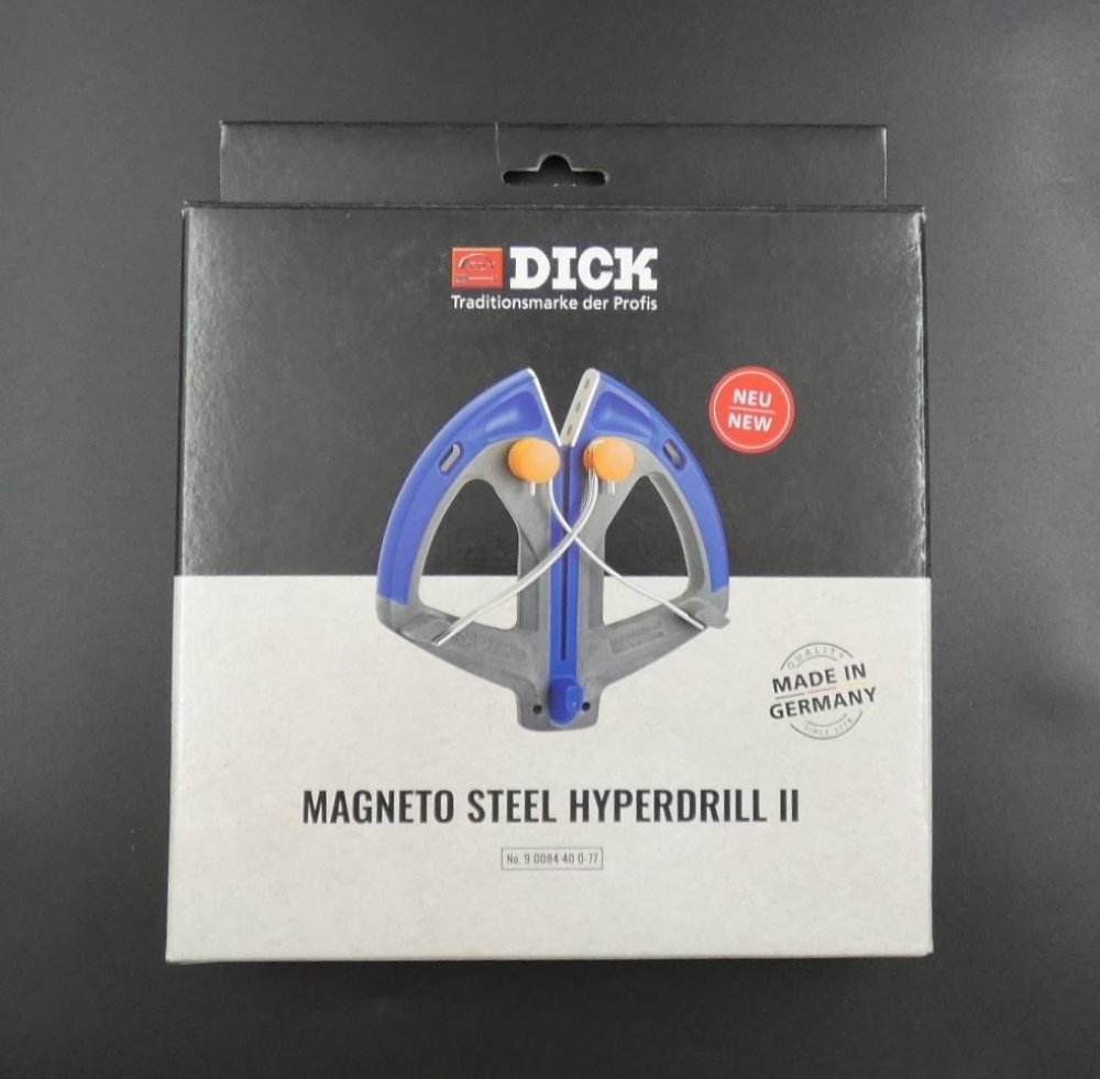 Protahovací brousek "ocílka" s magnetem DICK Magneto Steel HyperDrill IINová generaceBrousek s vylepšenými vlastnostmi.Magneto Steel HyperDrill II mají nově vyvinuté brusné dráty s vylepšenými vlastnostmi zajišťujícími jemné a rovnoměrné broušení nožů.Přestože se na první pohled jedná o stejný brousek, jako předchozí generace Magneto Steel HyperDrill, tak brusné segmenty "dráty" jsou nové s vylepšenými vlastnostmi a pro lepší rozlišení od předchozí generace brousků je brousek Magneto HyperDrill II nově vě vybaven žlutými držáky brusných segmentů (drátů). Typ Magneto Steel HyperDrill II je nejen konstrukčně odlišný od jiných protahovacích brousků, ale oproti jiným je vybaven integrovanými magnety v okrajích vodící části brousku. Magnetické části napomáhají lépe udržet nůž ve stejné poloze vůči brusným segmentům a tím udržet optimální úhel broušení z obou stran broušeného nože.Dále tento brousek má na okraji vodící brusné části nerezové chráničky, snižující poškození brousku broušeným nožem. Stejně jako ostatní protahovací brousky je tento brousek vybaven otvory pro pevné uchycení na pracovišti a nebo jen pro zavěšení. Protahovací brousky "ocílky" dokážou plnohodnotně nahradit klasické ocílky. Svou konstrukcí zajišťují stále stejný úhel broušení. Protahovací ocílky jsou mnohdy lépe využitelné především v gastronomii a v domácnostech právě pro svou nenáročnou obsluhu, kterou zvládne téměř každý. Broušení se provádí jednoduchým způsobem. Jednou rukou přidržujeme protahovací brousek brusnými segmenty(brusnými dráty) směrem k sobě a druhou rukou protahujeme ostří nože mezi brusnými segmenty směrem dolů a zároveň směrem k sobě. Broušení nože provádíme směrem od rukojetě nože ke špici nože.Výrobek Německé firmy F.Dick