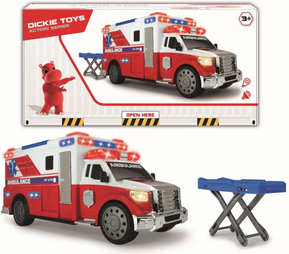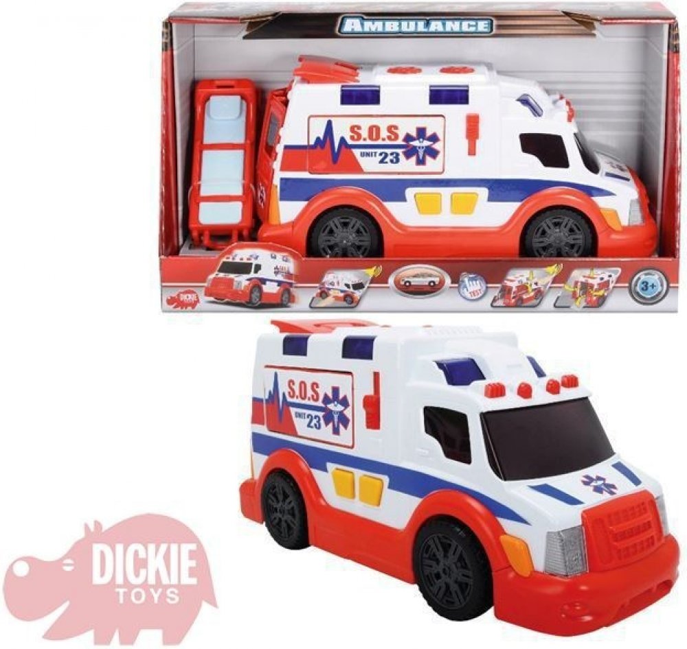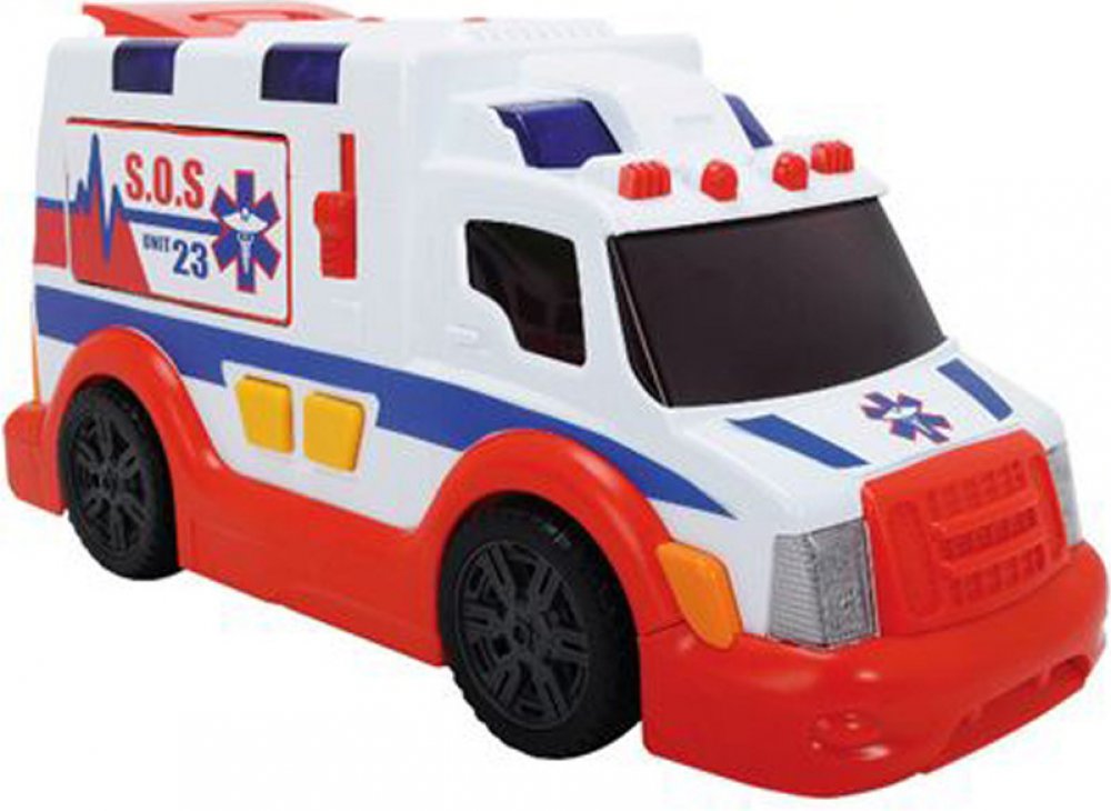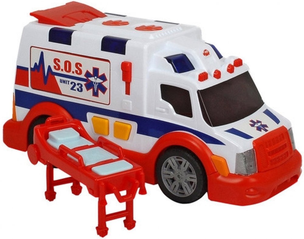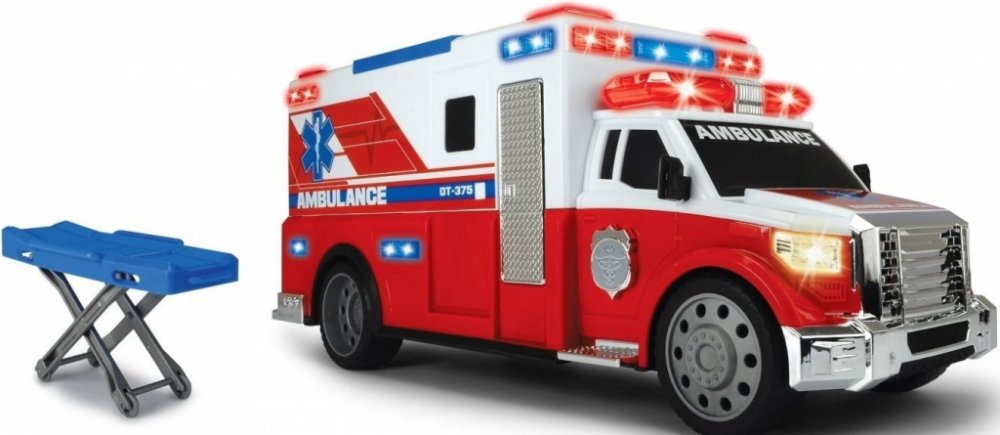 Toto auto ambulance je s motorizovaným pohybem vpřed. Zaujme každé malé dítě, které chce pomáhat nemocným pacientům. Nosítka pro pacienty jsou součástí balení. Auto má otevírací zadní dveře. Délka auta je 33 cm. Součástí jsou nosítka. Světelné a zvukové efekty. Otevírací zadní dveře. Jsou potřeba baterie 2 x AA. Vhodné pro děti od 3 let.