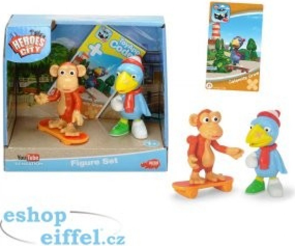 Set figurek ze seriálu Hrdinové velkoměsta (Statečná autíčka). Pták Pohromák a Opičák, pohyblivé končetiny, skateboard na volnoběh. Velikost 8 cm.