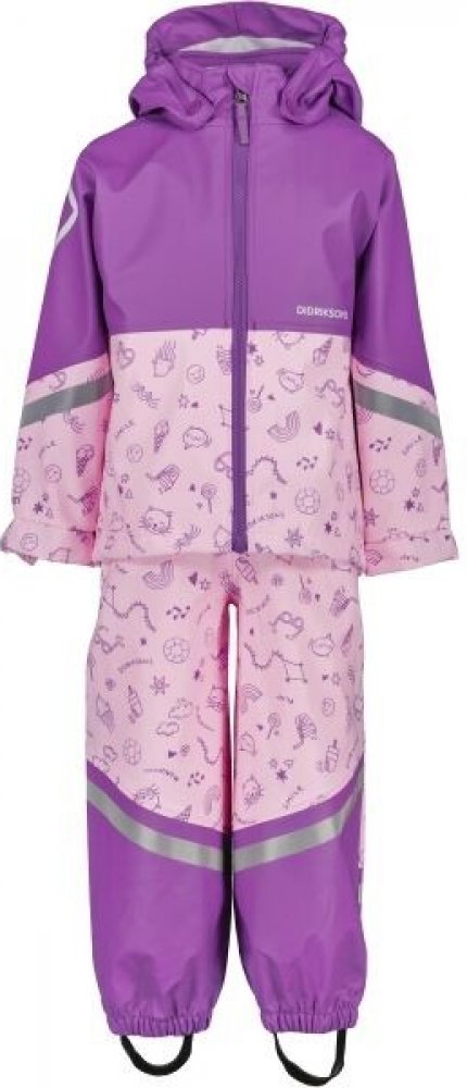 Dívčí set Didriksons WATERMAN je plně větruodolný a voděodolný kousek do deště pro zábavné dny venku. Má svařované švy pro 100% voděodolnou konstrukci. Bunda do deště má odepínací kapuci se zapínáním na patentky a viditelné reflexní detaily na zádech a manžetách. Manžety jsou nastavitelné pomocí patentek a bunda má přední zip. Vnitřní límec je podšitý měkkým fleecem. Kalhoty do deště mají vysokou náprsenku s nastavitelnými šlemi a patentky na bocích. Lemy mají reflexní detaily a jsou elastické, aby dovnitř neprosakovala voda. Pásky na nohy jsou nastavitelné a vyměnitelné.