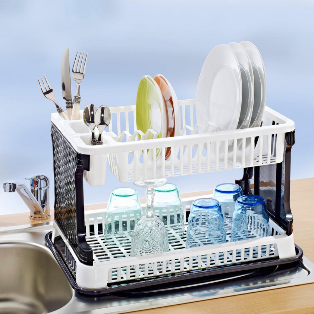 Dvoupatrový – tedy spoustu místa, s podložkou pro odkapanou vodu.