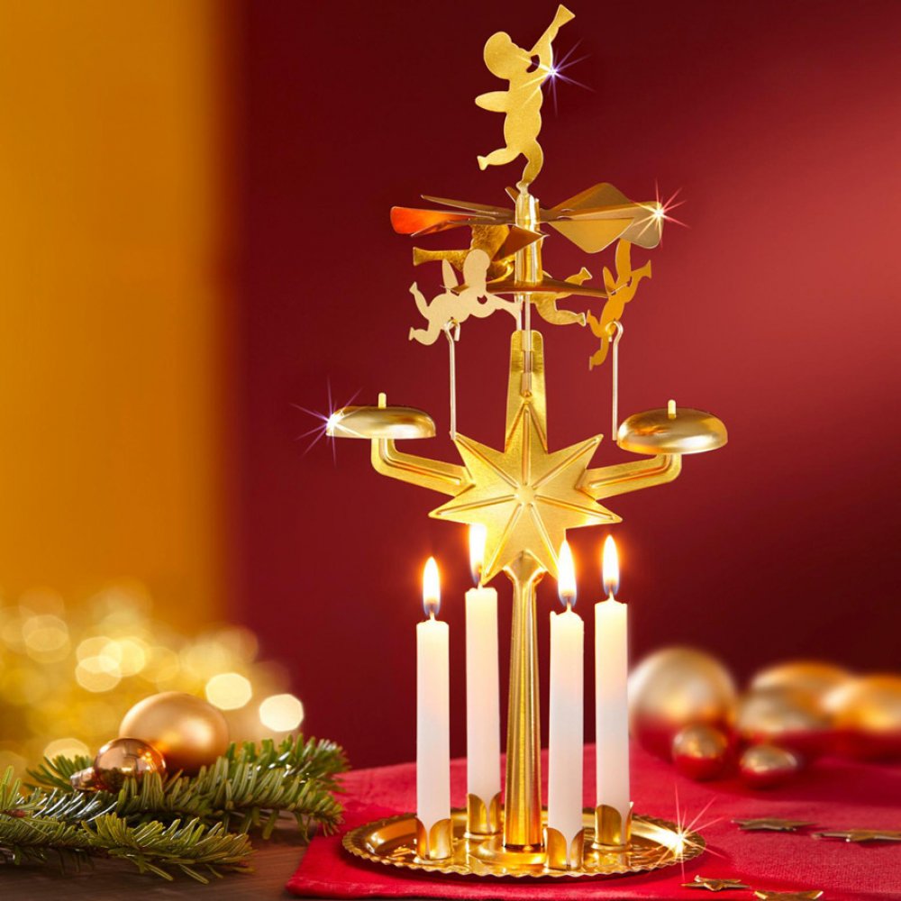 Nádherná reinterpretace známé vánoční pyramidy: hořící svíčky otáčí pyramidou, andílci létají vzduchem a dotýkají se přitom zvonečků.