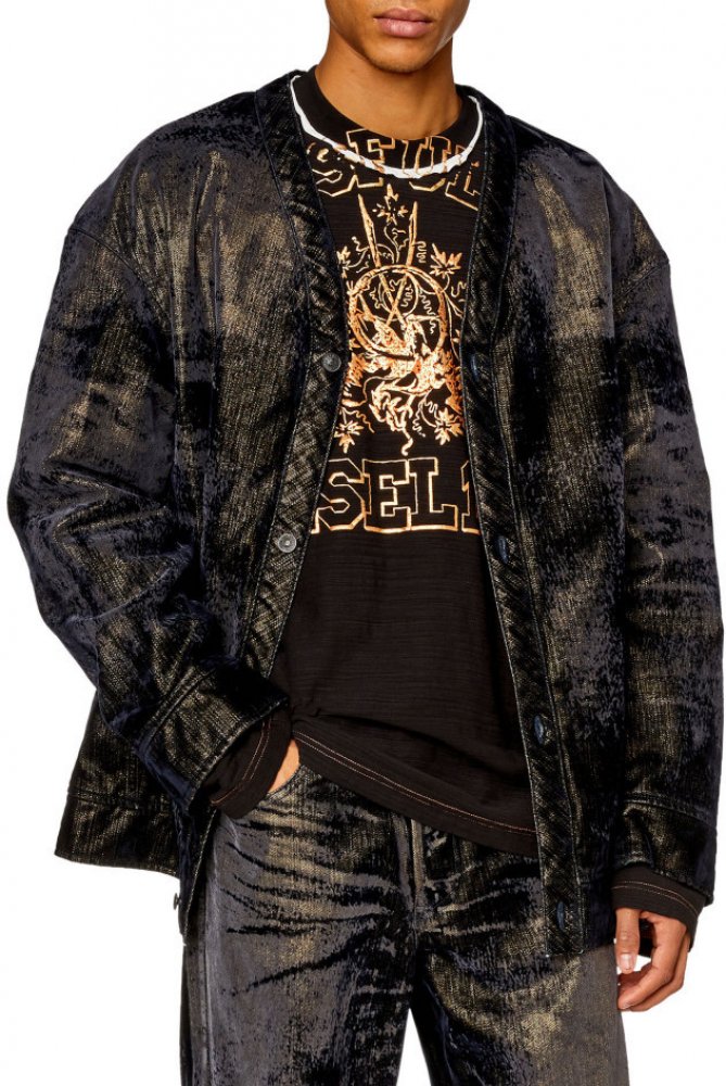 Pánská džínová bunda. Design s originálním povrchem má klasickou siluetu se zapínáním na knoflíky ve stylu cardiganu. Pevná džínovina spolu se speciálním washem spojuje experimentální přístup společnosti Diesel a esenci tradičního stylu. Vrstvená konstrukce kombinuje černý denim, zlatou laminovanou nit a sametový potisk. Celkový dojem pak vytváří vícerozměrný povrch s přirozeným živým vzhledem. Mo...