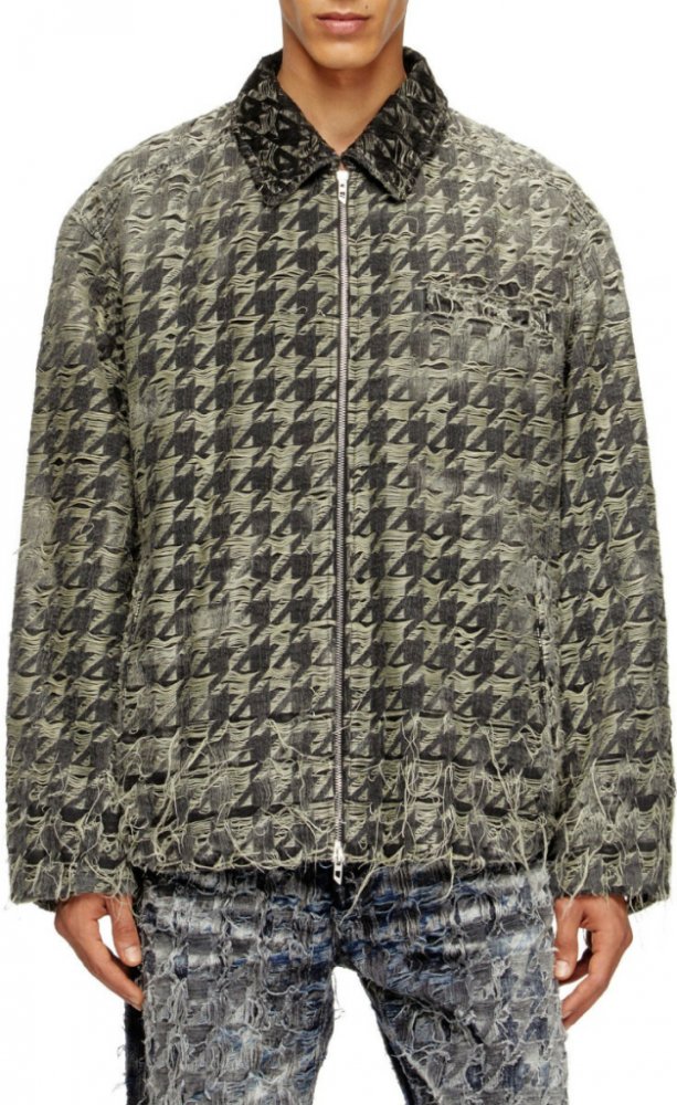 Pánská bunda. Silueta rovného uvolněného střihu s mírně sníženými rukávy a límcem. Doplněná podšívkou pro hladké vrstvení. Zapínání na kovový zip je zdobené jezdci ve tvaru písmene D. Vyrobená z denimu s celoplošným vzorem s kontrasty v černé a šedé barvě, které vytvářejí hmatatelný vzor ve tvaru kohoutí stopy. Model má na sobě velikost L a měří 188 cm. Velikost odpovídá běžnému značení, při výběr...