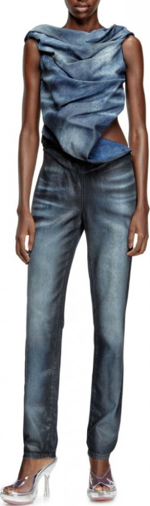 Dámský džínový overal. Model je pzoruhodným kouskem z kolekce Diesel Fashion Show jaro-léto 2025. Materiál kombinuje dvě tkaniny s mramorovým praním v tonálních odstínech, ušité tak, aby kopírovaly přirozené křivky těla a asymetrický splývavý top, který zcela odhaluje záda. Laserové techniky vytvářejí vousy, které kopírují křivky látky, která je poté nastříkána několika vrstvami laku a pečlivě ručně vyžehlena pro lesklý povrch. Modelka má na sobě velikost S a měří 175 cm.
