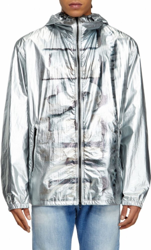 Pánská přechodová bunda. Nepřehlédnutelný design tvořený metalicky lesklým povrchem. Zdobena vertikálním potiskem maxi loga Diesel For Successful Living umístěného na přední i zadní straně. Rovný střih je doplněn nastavitelnou kapucí a zapínáním na dvoucestný zip. Praktičnost doplňují boční kapsy se zipem a pružné manžety na rukávech. Materiálové složení zaručuje dokonalou lehkost, skladnost a částečnou odolnost proti větru a příjemný pocit při nošení. Velmi originální kousek, který stylově doladí váš ležérní outfit. Model má na sobě velikost 52 a měří 182 cm.