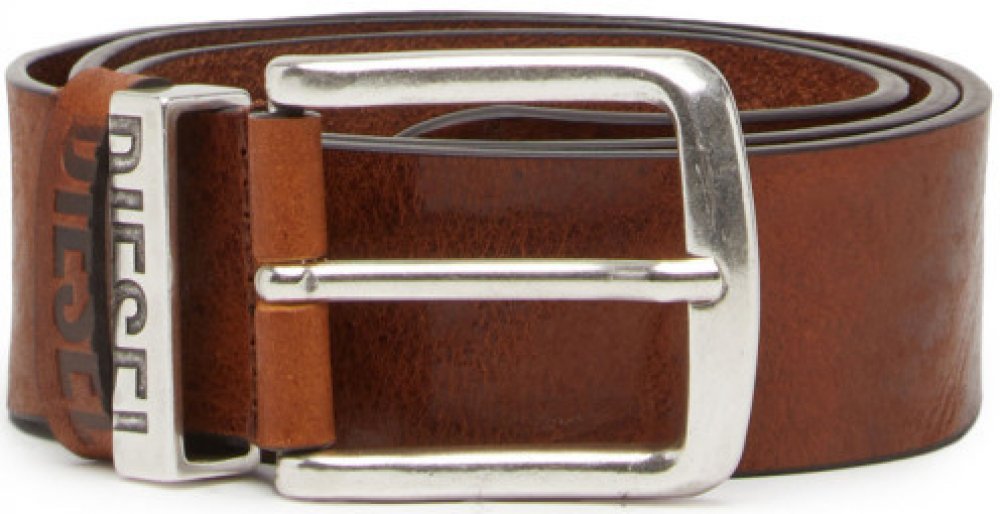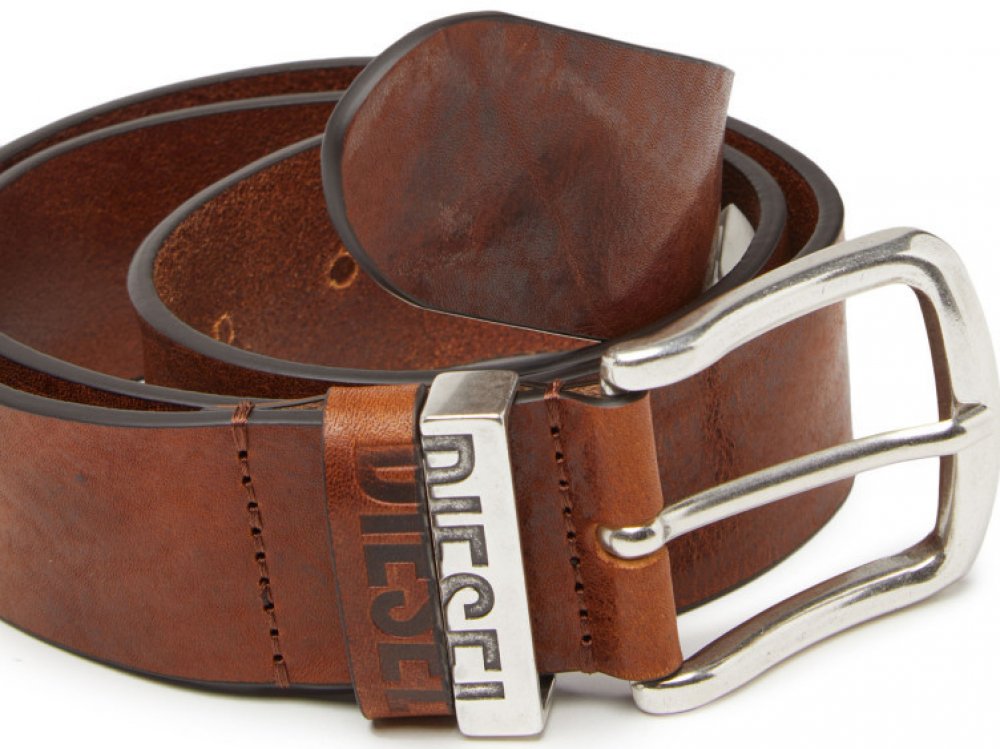 Kožený opasek z Responsible Collection, který je vyčiněný rostlinami. Zapíná se na špendlíkovou přezku a pro větší přiléhavost jsou na tomto modelu dvě praktická poutka. Z nichž jedno je kožené a druhé kovové. Kovové poutko je originálně zdobeno vytlačeným nápisem značky Diesel.