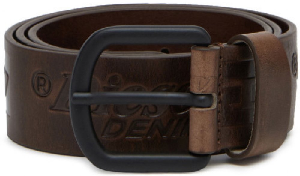Pánský opasek. Vyroben z pevné hovězí kůže. Celoplošně zdoben vylisovanými nápisy Diesel Industry Denim Division D. Černá matná přezka je originální obměnou klasické stříbrné přezky. Design je inspirován archivními modely pásků Diesel.