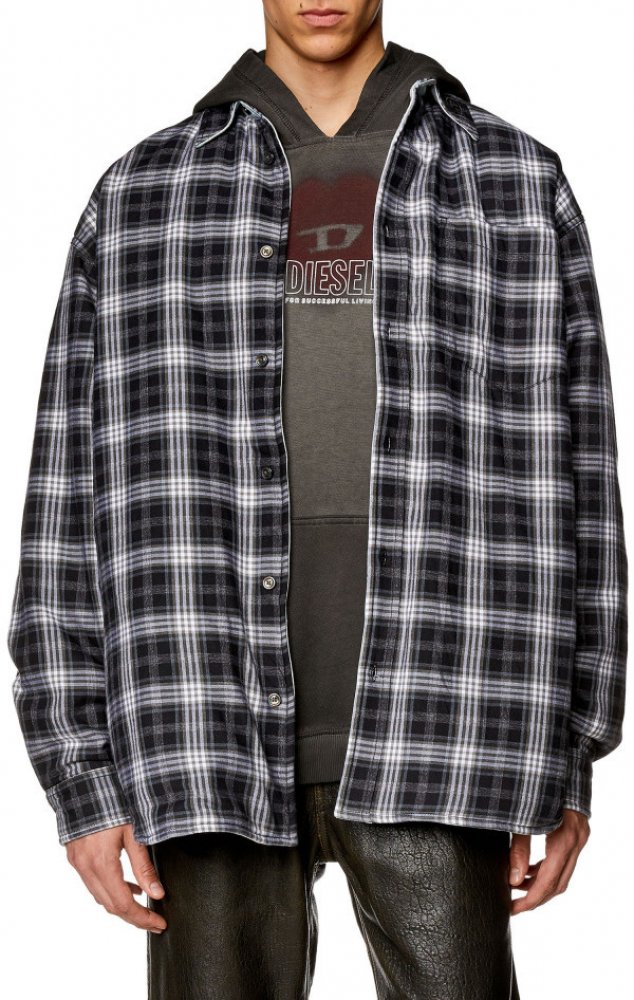 Pánská oboustranná košile. Volný oversize střih s dlouhým rukávem. Ušita ze světle modrého denimu a měkkého kostkovaného flanelu. Na vzorované straně má vyšívaný límeček s logem. Kostkovaná strana: náprsní kapsa a boční kapsy /