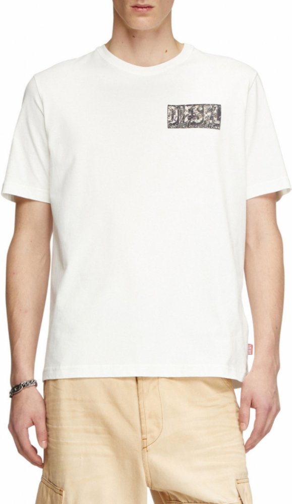 Pánské tričko s krátkým rukávem a kulatým výstřihem. Vyrobeno z certifikované organické bavlny, která je šetrná k pokožce i k přírodě. Jednoduchost a styl v jednom kousku! Regular volný rovný střih. Na hrudi se nachází gabardénová nášivka s aktuálním ,,glitch camo" vzorem a logem For Successful Living. Tričko je doplněno o kontrastní Diesel nášivku na levém bočním švu, což mu dodává další originální detail. Model má na sobě velikost L a měří 182 cm. Velikost odpovídá běžnému značení, při výběru zvolte své obvyklé číslo.
