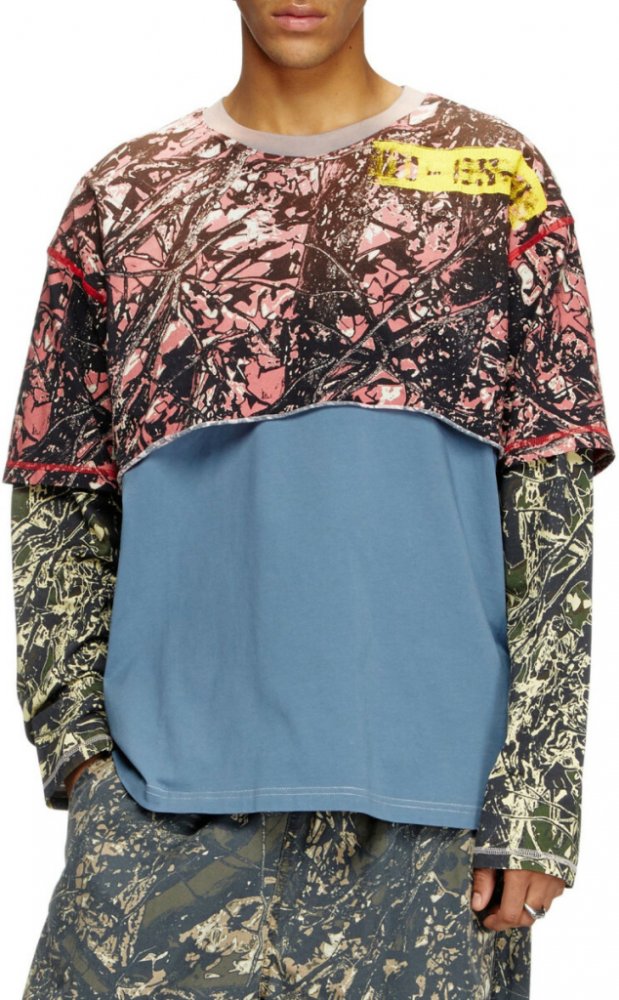 Pánské vrstvené triko s dlouhým rukávem. Volný loose fit střih je složen ze dvou vrstev ušitých z bavlněného žerzeje, z nichž horní vrstva je lehčí a vyrobená ve stylu DIY. Originální design je kombinací plných barev a moderního městského vzoru, znázorňujícího atypickou verzi kamufláže. Popraskaný nápis loga a lehké vyblednutí přitahují oči k ramenům. Model má na sobě velikost L a měří 182 cm. Velikost odpovídá běžnému značení, při výběru zvolte své obvyklé číslo.