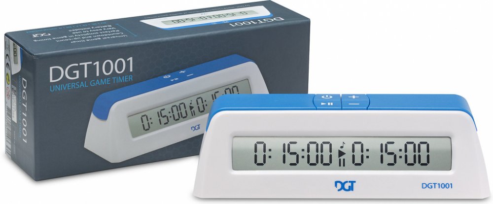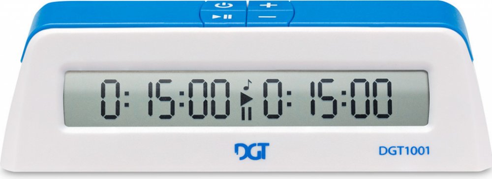 Elektronický šachový hodinový stroj DGT 1001 v bílé barvě je vybaven velkým a přehledným displejem, přitom je jednoduchý na ovládání a klasický ve svém vzhledu. DGT 1001 je díky svým malým rozměrům snadno přenosný a snadno se skladuje. Hmotnost hodin s baterií je jen něco málo přes 100 gramů! Největší jeho výhodou je však cena - mnohem nižší než cena většiny hodin dostupných na trhu.