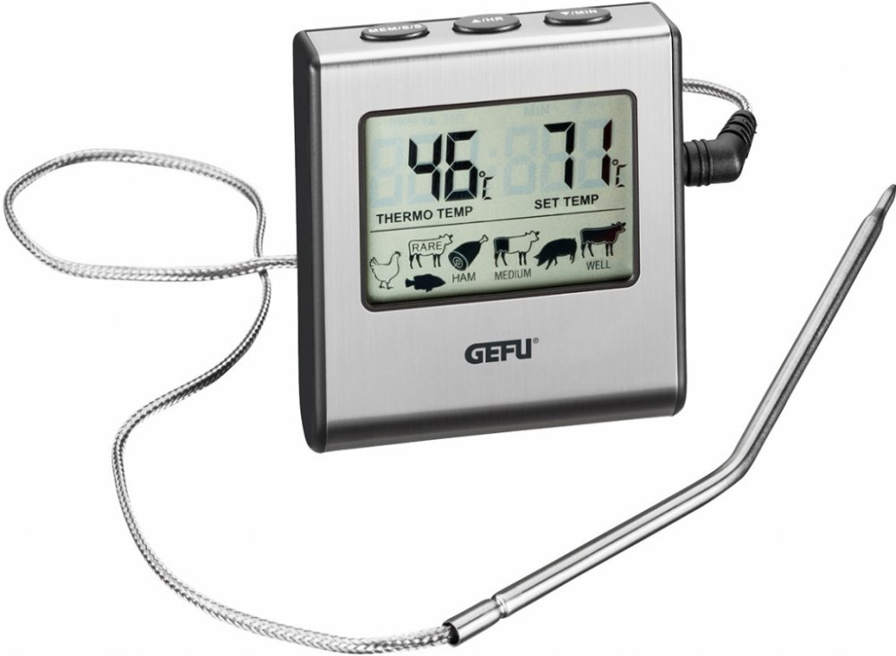 Digitální teploměr na pečení lze nastavit na teploty až 300 °C (572 °F). Přednastavené teploty jádra pro různé druhy masa dělají z „přesného vaření“ dětskou hru. Disponuje magnetem, který umožňuje snadné nalepení na sporák, a stojánkem, který umožňuje jeho umístění ve vzpřímené poloze kdekoli. Jakmile je dosaženo přednastavené teploty pečeně, zazní alarm – nic se nemůže pokazit! Pečený teploměr má navíc funkci časovače až na 99 hodin a 59 minut.
