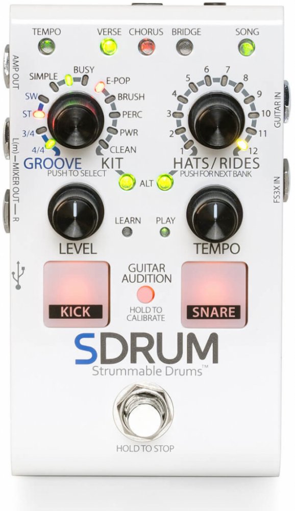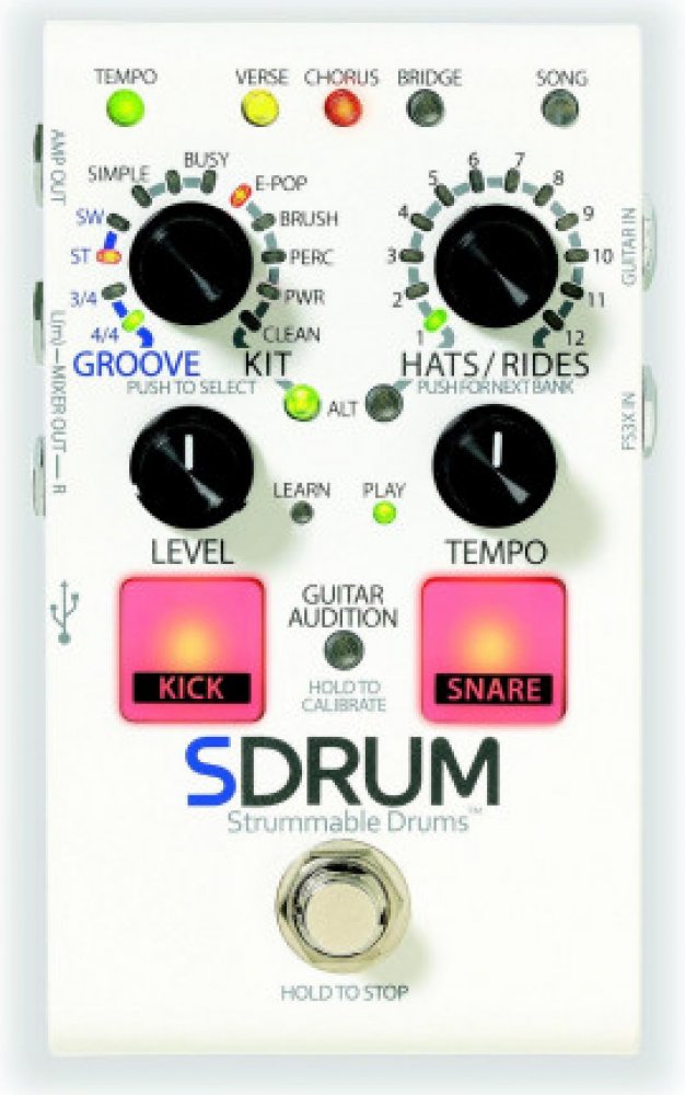 Firma Digitech zaznamenala velký úspěch s modely Trio a Trio+. Mašinky, které umí generovat bubeníká s basovou kytarou. SDRUM je verzí podlahového background efektu, který disponuje řadou samplů bicích souprav v profesionální audio kvalitě a přidává také dvojici malých integrovaných padů.Výrobce využívá sofistikované technologie BeatScratch, pomocí níž je programovatelný SDRUM schopen detekovat rytmické členění figury (stačí pouhý zvuk tlumených strun) hrané na kytaru, basu apod. a poté jej převést do patternu s identickým tempem a vhodným taktem.Zařízení nabízí výběr z 5 bicích kitů s širokou paletou stylů, 12 rozdílných typů hi-hat a ridů, pamatuje si základní rozdělení formy skladby (sloka, refrén, mezihra), umožňuje uložení jednotlivých songů do 36 presetů a rytmus si můžete díky podsvíceným padům (Kick a Snare) umístěným nad nášlapným footswitchem nastavit také manuálně.Samozřejmostí je plynulá editace tempa, změna taktu (3/4, 4/4), nastavení feelu (swing, straight), posun hodnot u hi-hat a ridu (1/4, 1/8, 1/16) nebo jejich náhrada za alternativní nástroje a řada dalších funkcí. Konektivita sestává z nástrojového vstupu, konektoru pro připojení externího footswitche, trojice výstupů (1x Amp, 2 x Mix), zdířky 9V adapteru, USB portu a stereo minijacku JamSync pro zařazení looperů JamMan.Inteligentní bicí automat DigiTech SDRUM se díky svým schopnostem může stát velmi praktickým pomocníkem při cvičení, skládání nebo jako doprovodná rytmická banka pro menší kapely bez bubeníka.