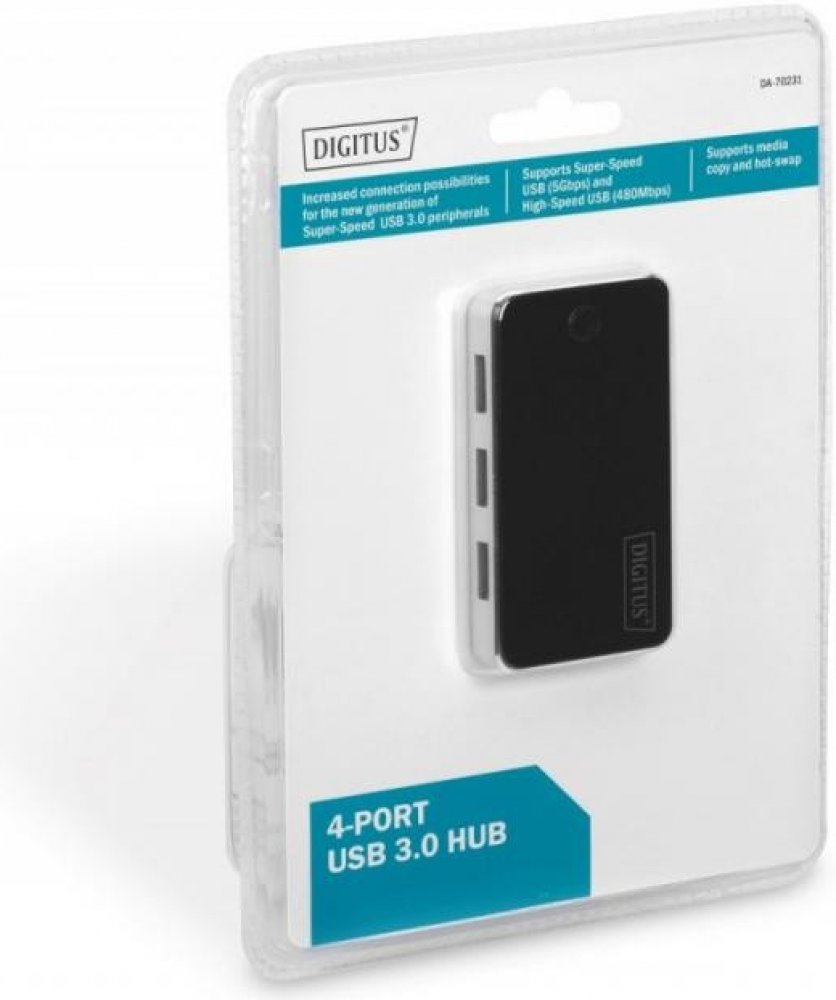 Rozbočovač DIGITUS USB 3.0 4-Port usnadňuje připojení až 4 USB zařízení současně k počítači PC nebo Mac. Připojte svá oblíbená zařízení USB a profitujte z velmi rychlého připojení (až 10krát rychlejší než USB 2.0). Tento produkt má jasný a elegantní design s klavírní černou povrchovou úpravou na horní a spodní straně a hliníkovou hranou.