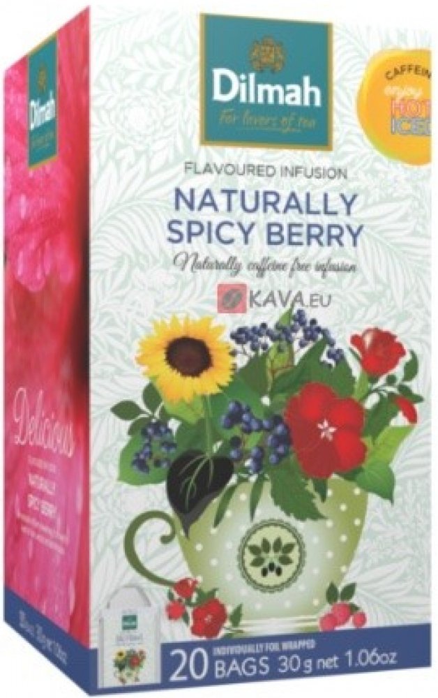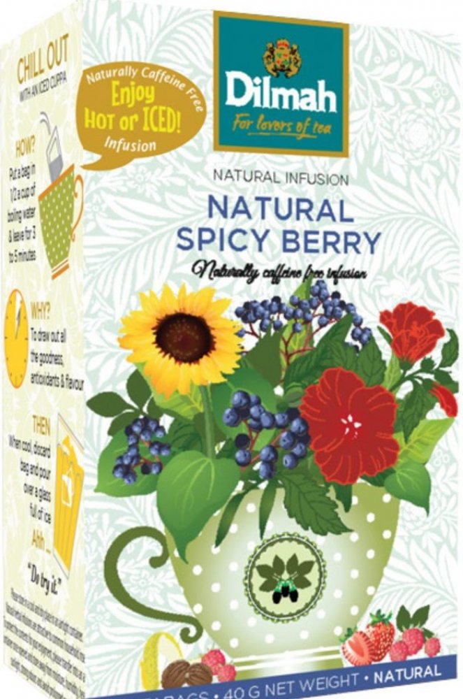 Unikátní přírodní směs bobulovitého ovoce, bylinek a koření. Čaj Dilmah Naturally Spicy Berry má nezaměnitelnou ovocnou chuť a aroma. Nedoporučuje se přidávat mléko. Med je vhodný jako sladidlo.