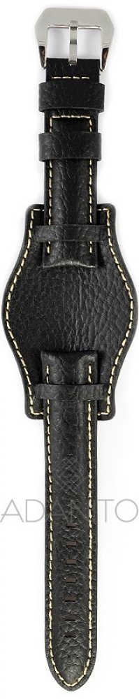 Univerzální řemínek VINTAGE na hodinky z hovězí kůže od španělské firmy DILOY má šířku 20 mm, černou barvu a stříbrnou přezku. Řemínek ve stylu AVIATOR je prošitý béžovou nití a má buvolí texturu. Pouzdro hodinek je od pokožky odděleno podložkou. Rozměr podložky je 80 x 55 mm. Tloušťka polstrovaného řemínku je od 2,5 do 7 mm, s podložkou 10,5 mm.
