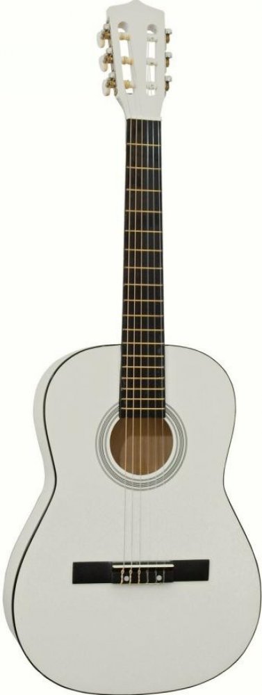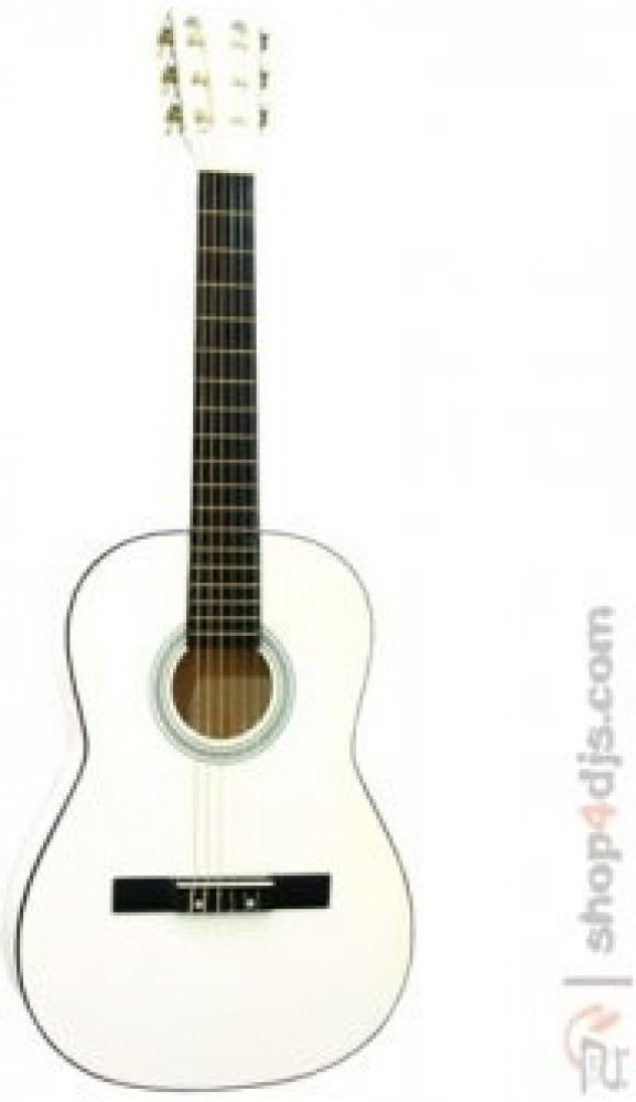 Klasická 3/4 kytara. Vrchní deska, spodní deska a luby akát, krk javor, hmatník mořená překližka, kobylka mořený javor. Barva bílá. Color: White Weight: 1,63 kg
