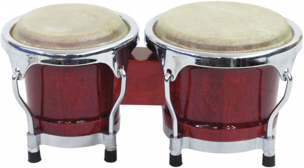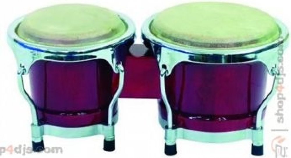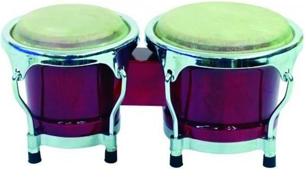 Profesionální bongo set, 4" + 5", barva vínově červená. Dřevěné korpusy s přírodní kůží. Tradiční napínací obroučky.