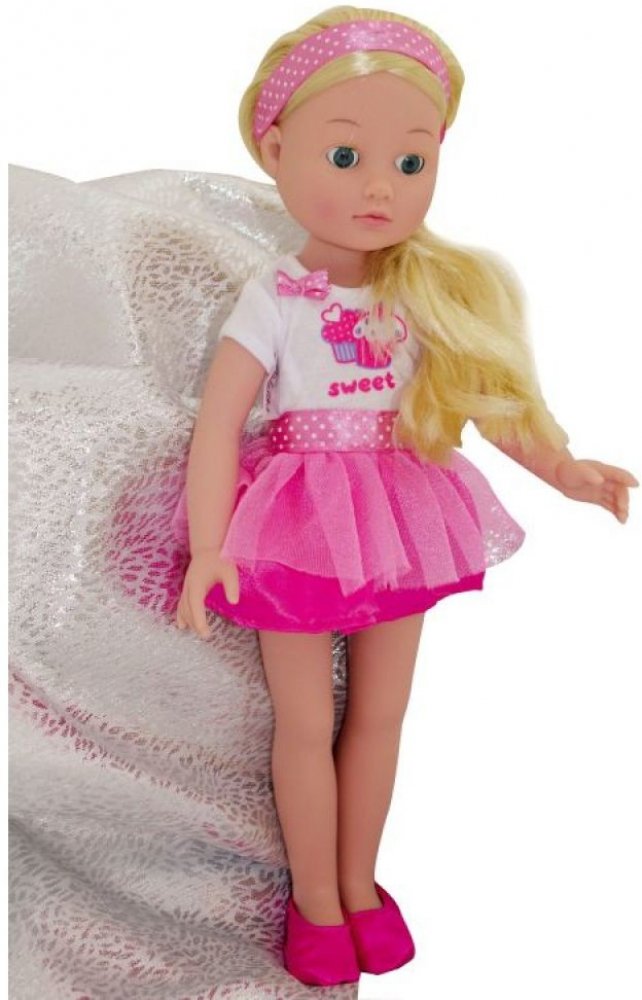 Její blond vlásky jsou sčesané do copu. Na nohou má balerínky, aby si holčičky mohly s panenkou přehrávat i různé baletní sestavy.