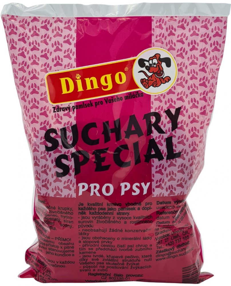 DINGO suchary krmíte suché – PŘÍMO! Vzhledem k vysokému obsahu sušiny musí mít pes přístup k pitné vodě. Denní dávku stanovujeme dle velikosti psa, jeho kondice a výkonu. Jsou vítanou svačinou v každou denní dobu.