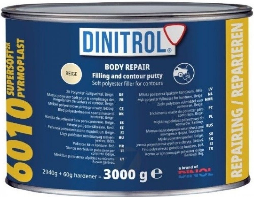 Tmel Dinitrol 6010 je dvousložkový plnící, stěrkový tmel na polyesterové bázi. Přilne téměř na všech podkladech, které se vyskytují v oblasti motorových vozidel, jako ocelový plech, základní nátěry, dvousložkový plnič a do matova vybroušené krycí laky. Na termoplastické laky se tento tmel nesmí nanášet, protože existuje nebezpečí tvoření prasklin a špatné přilnavosti. U aluminia je nutno provést zkoušku, protože se podle druhu slitiny může vyskytnout různé chování při přilnavosti. Použití: Je vhodný k odstranění nerovností na karosériích vozů, plechových konstrukcích, k zarovnávání skříní strojů, opravám umělých hmot vyztužených skleněnými vlákny (GFK), ke zlepšení betonu, zdiva, dřevěných desek atd. Nerovnosti až do hloubky ca 10 mm se na svislých plochách nechají vyrovnat bez námahy při jednom pracovním cyklu. Balení: 3kg plechovka Barva: světle šedá Tužidlo je součástí balení.