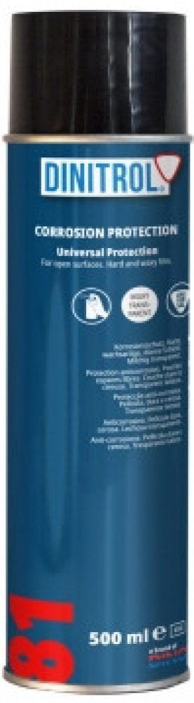 DINITROL 81 po rychlém odpaření rozpouštědel vytváří pevný transparetní matný film s výbornými ochrannými vlastnostmi před vznikem koroze. Hodí se pro lakované i nelakované povrchy, železné a neželezné kovy. Ideální řešení jako ochranný nástřik podvozků historických vozidel, jelikož není viditelný, nelepí prach. V případě potřeby jej lze odstranit aromatickým rozpouštědlem (technický benzín, alkoh...