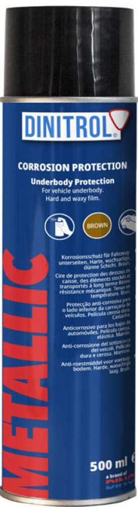 DINITROL Metallic - je ochranný nástřik podvozku na bázi tvrdých sysntetických vosků s pigmenty Zinku. Díky svým excelntním výsledkům se řadí mezi nejúčinnější formy podvozkové ochrany. Vhodný pro osobní, nákladní vozidla a autobusy. Díky vysokému obsahu Zinku je bronzové barvy.