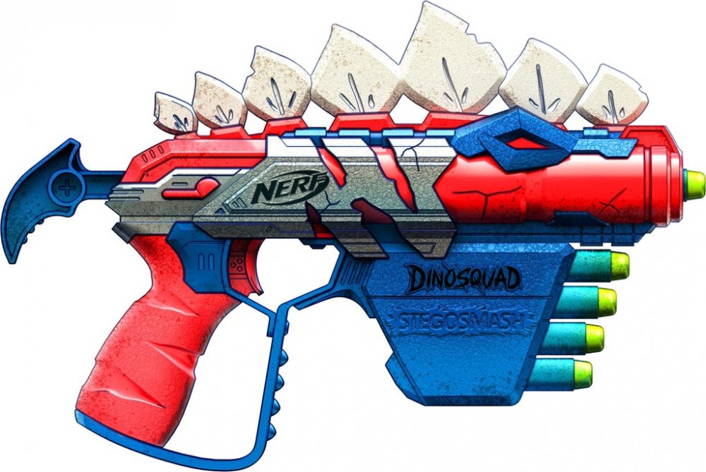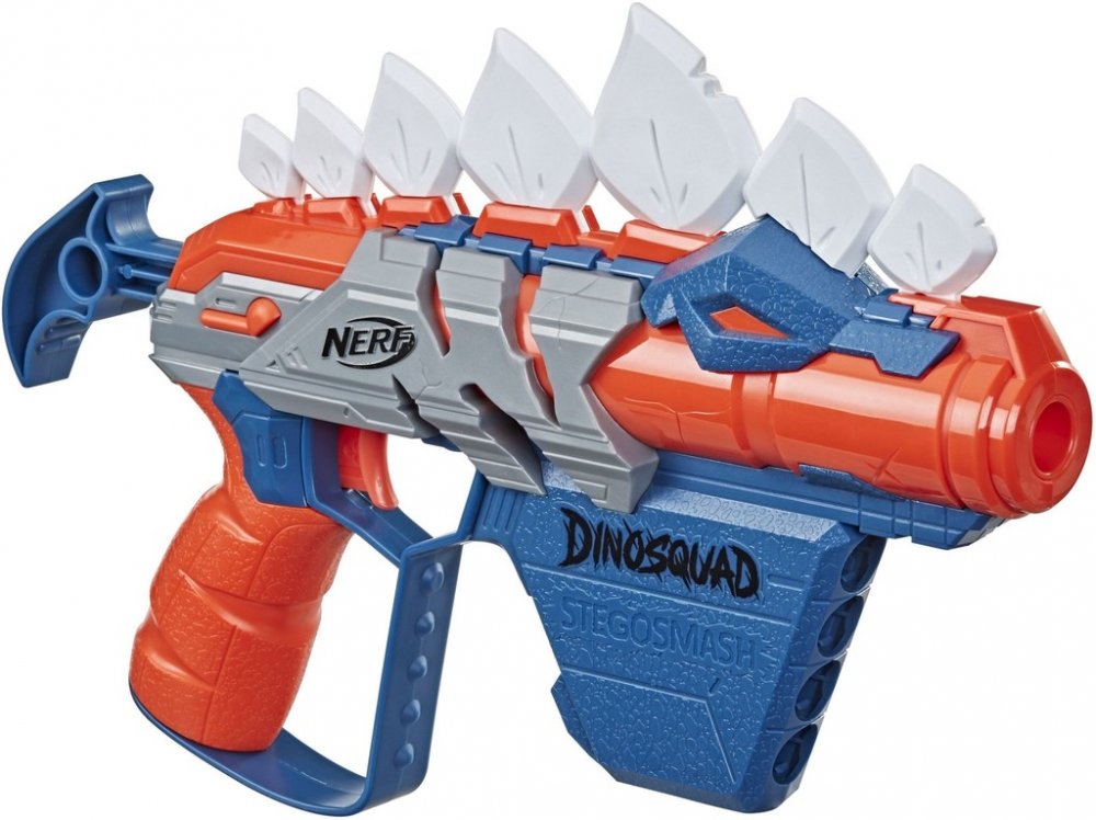 Využijte mimořádnou sílu dinosauřích titánů a zažijte s nimi úžasná dobrodružství! Postavte se do čela jako obránci s blasterem Nerf DinoSquad Stego-smash, který má úžasné dinosauří detaily a vypadá jako stegosaurus. Do přední části vložíte projektil, natáhněte páčku u rukojeti a stisknutím spouště vystřelíte (nejsou potřeba baterie). Dodává se s 5 oficiálními pěnovými náboji Nerf Elite – blaster sám o sobě pojme 4 náboje, ať je při nabíjení máte hezky po ruce. Doporučujeme používat ochranu zraku (není součástí balení).