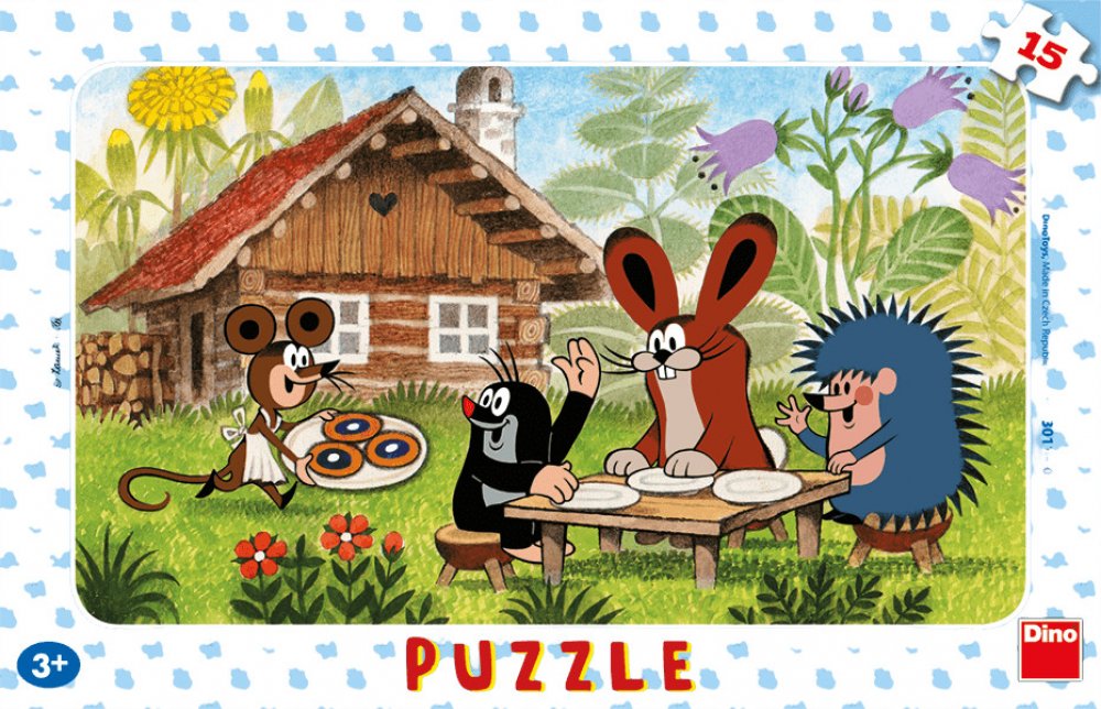 Dětské deskové puzzle (dílky se skládají přímo na přiloženou podložku s rámečkem) s Krtečkem a jeho kamarády u stolečku.