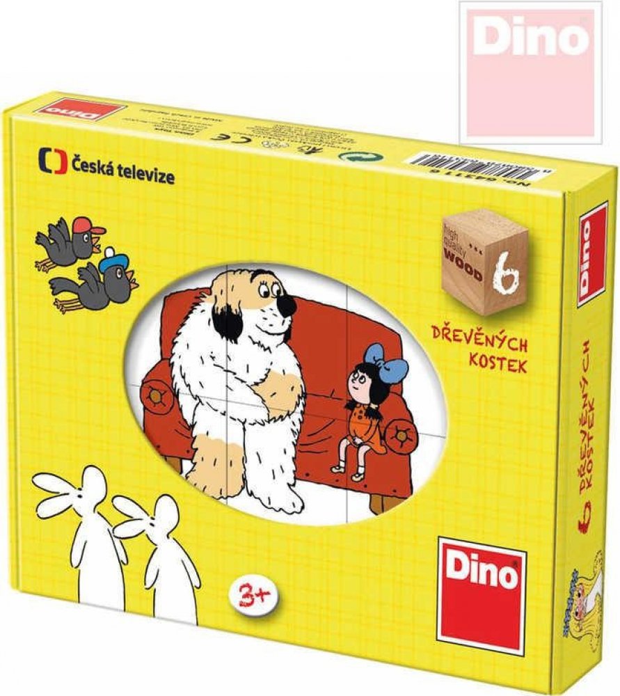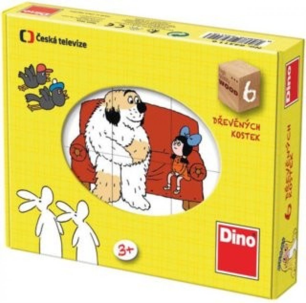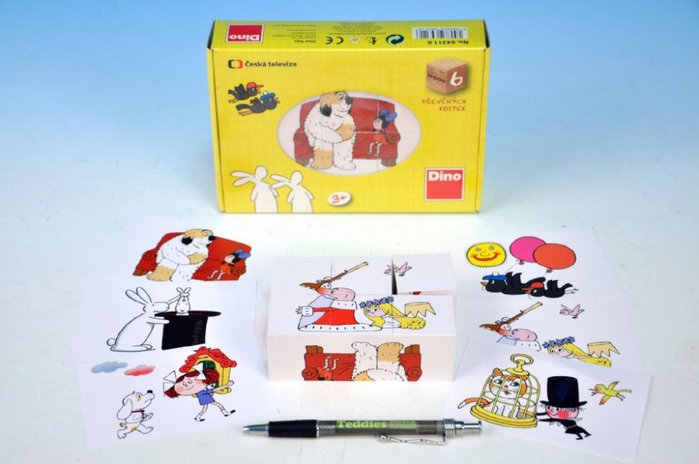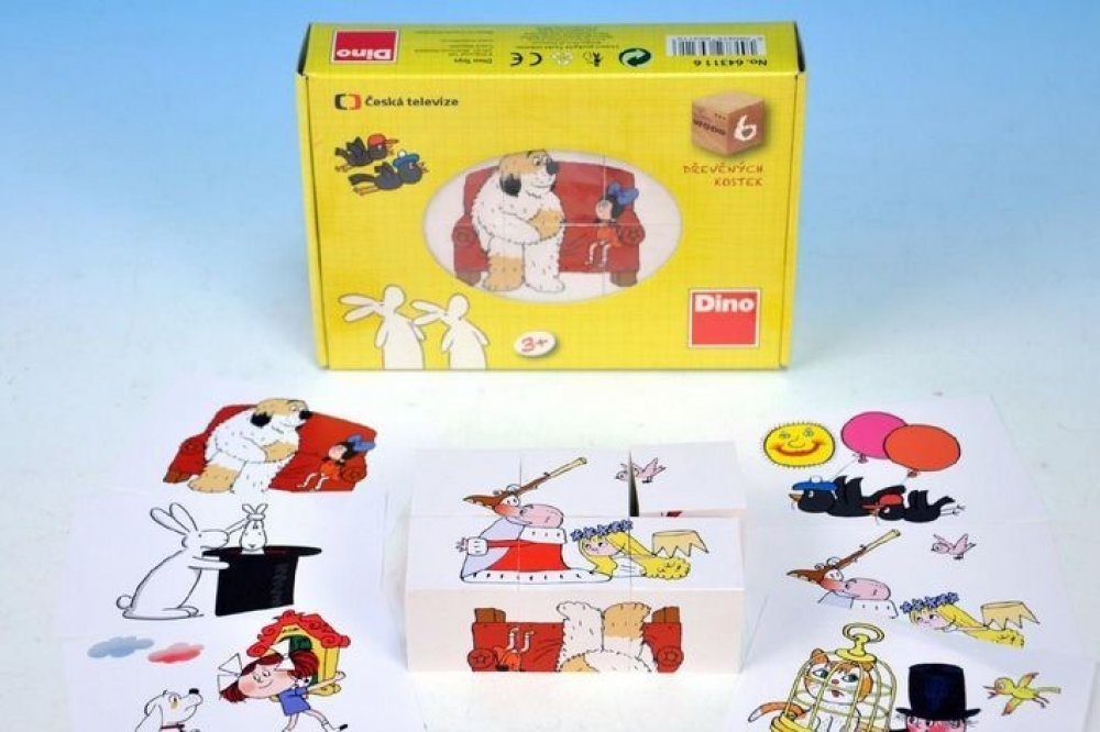 Dětské dřevěné kostky (kubusy) s obrázky pohádek - Maxipes Fík, Bob a Bobek, Říkání o víle Amálce, Káťa a Škubánek, Kosí bratři a O Sazinkovi. Obrázkové kostky podporují u nejmenších dětí koordinaci a motoriku při bourání a stavění komínů, napomáhají chápání příčiny a následku. U starších dětí při skládání obrázků rozvíjí fantazii a logické myšlení a motivují k vyprávění příběhů. 6 obrázků - 6 kostek balených v kartonové krabičce. Dřevěné obrázkové kostky DINO jsou vyrobeny ze zdravotně nezávadných materiálů, splňují požadavky dané evropskou normou na bezpečnost hraček ČSN EN 71-1 a jsou atestované v ČR.