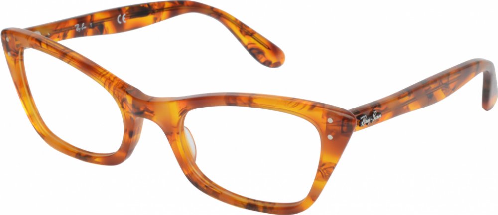 Dámské dioptrické brýle RB 5499 LADY BURBANK z aktuální kolekce značky Ray-Ban. Výrazné plastové obruby úzkého kočičího tvaru v jantarově žíhané barvě zdobí pouze dvě malé kovové tečky v přední části očnice a logo Ray-Ban na stranicích.