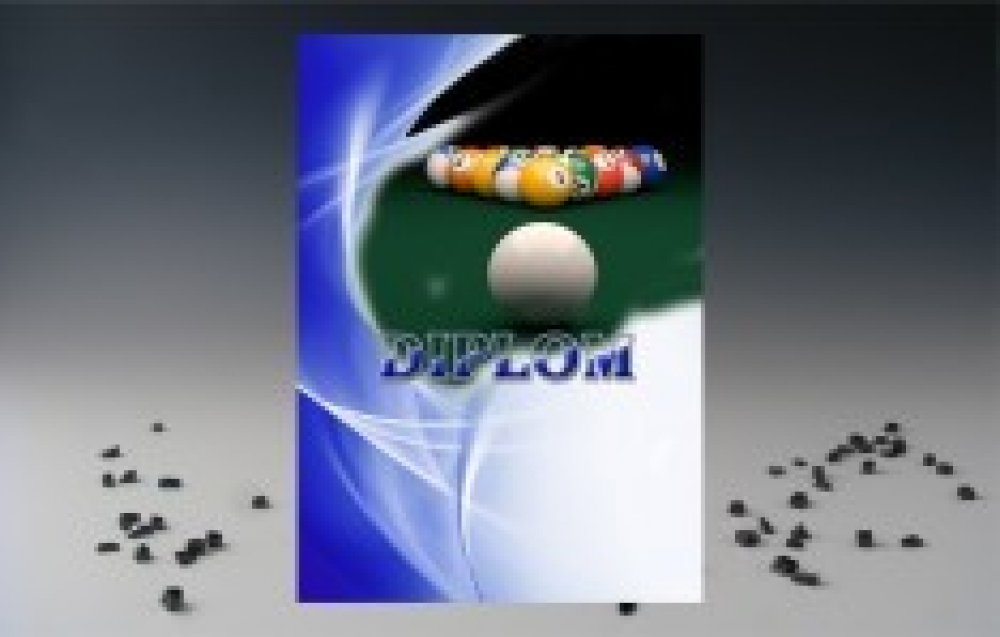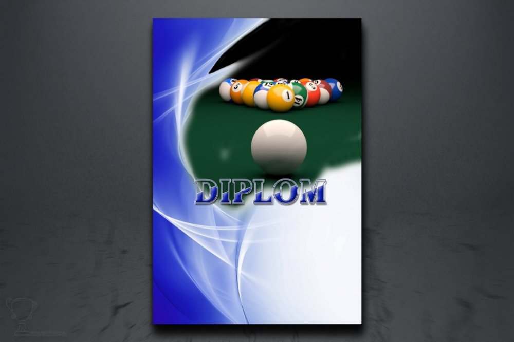 Diplom s motivem billiardu. Formát A5, A4, A3 Diplomy jsou vytištěny plnobarevně na matném papíru 300g/m2, umožňujícím jak ruční dopisování údajů, tak i dotisk v běžné kancelářské počítačové tiskárně (inkoustové, laserové).
