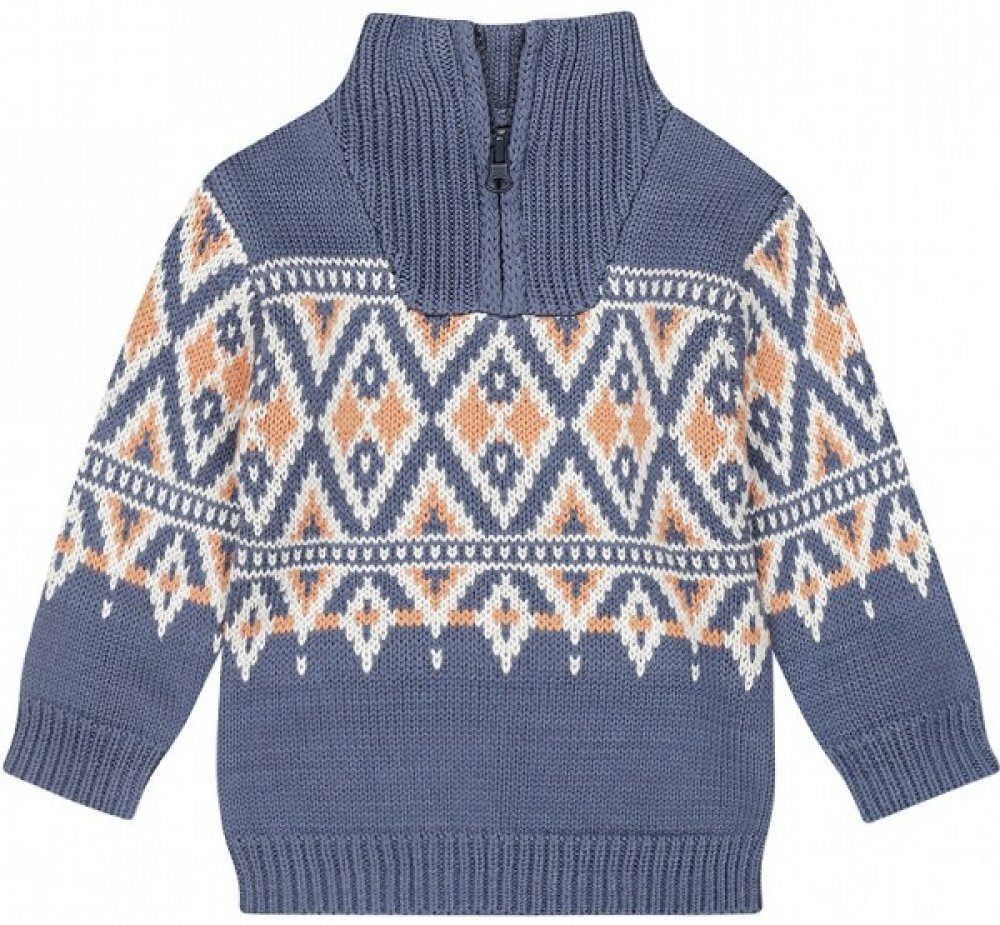 Stylový pletený svetr pro chlapce tmavě modrý s rolákem se zipem. Vzor v barvě koňakové a krémové dodává svetru sváteční ráz. Ideální do podzimních a zimních dnů.