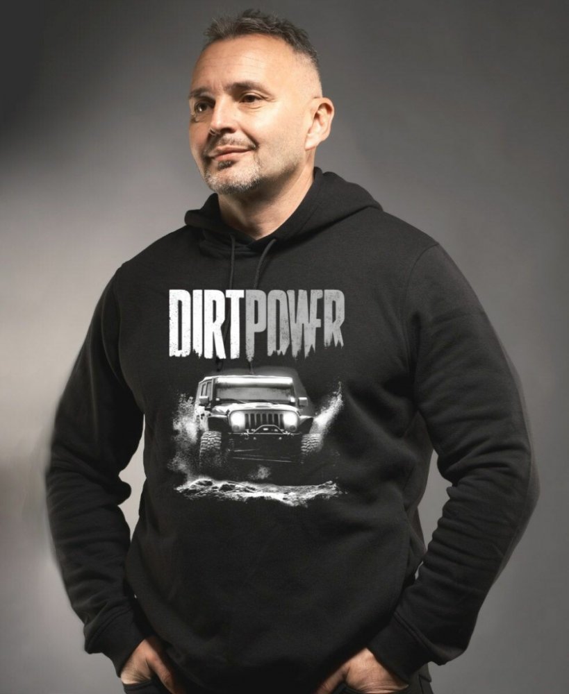 Dirt power, 4X4, bílý tisk. Pro ty, kteří se nebojí zašpinit! Terénní vůz ve víru bláta a hlíny je symbolem síly, odolnosti a nekonečného dobrodružství, které zvládne jen pohon všech čtyř kol. Ideální pro adrenalinové nadšence a off-road šílence. Tričko, mikina, kšiltovka, zástěra.