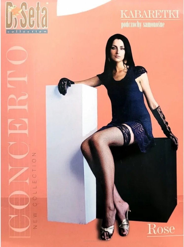 Dámské samodržící punčochy se síťovaným vzorem typu „kabaretka“ s malými oky. Vyrobené z ovíjené příze typu Lycra. Horní část se silikonovými pásky a elastickou krajkou. Bez vyznačené prstové části. Rozměry jednotlivých velikostí naleznete ZDE.Složení: 88 % Polyamid, 12 % Elastan.