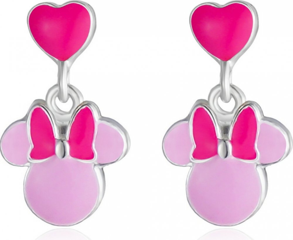 Roztomilé dětské visací náušnice MINI s motivem Minnie Mouse z oblíbeného světa Disney přinesou radost každé malé princezně!Tyto něžné náušnice jsou vyrobeny ze stříbra a zdobené pečlivě naneseným růžovým smaltem tmavší barvy na srdíčku a mašli a světlejší růžové barvy na hlavičce Minnie. Právě smalt jim dodává hravý a živý vzhled. Lesklá povrchová úprava zvýrazňuje detaily a zajišťuje elegantní v...