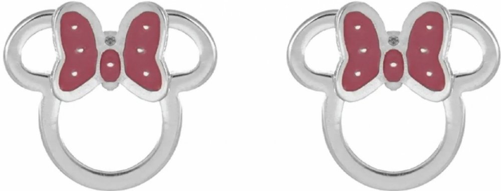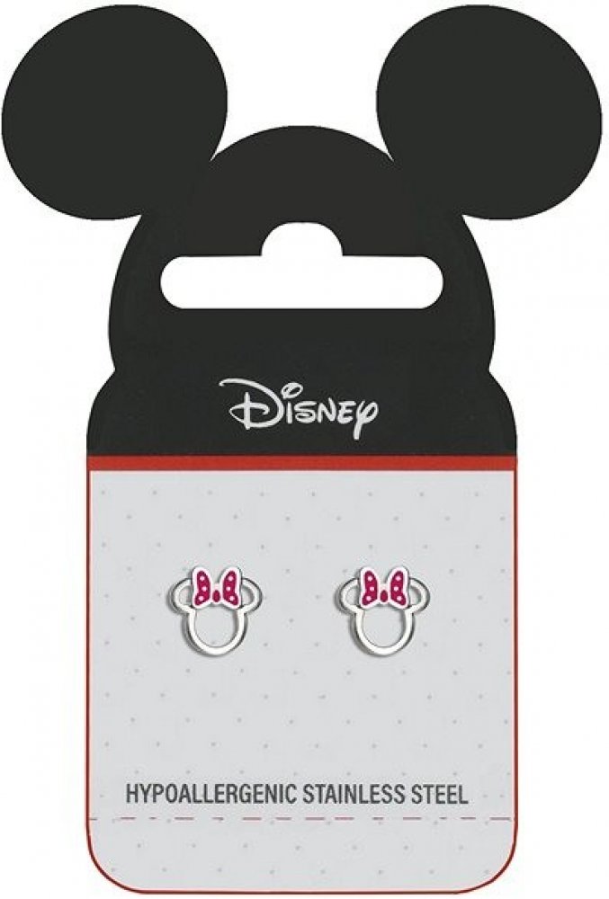 Náušnice s obrysy postavičky myšky Minnie Mouse od Disney jsou vyrobené z nerezové oceli. Náušnicím dominují mašle upravené smaltem v růžovém provedení s bílými puntíky, které šperk činí zcela neobyčejným. Tyto náušnice se zapínají puzetkou, která zajišťuje pohodlné nošení a zabraňuje ztrátě náušnic. Jsou dodávány ve stylové krabičce.