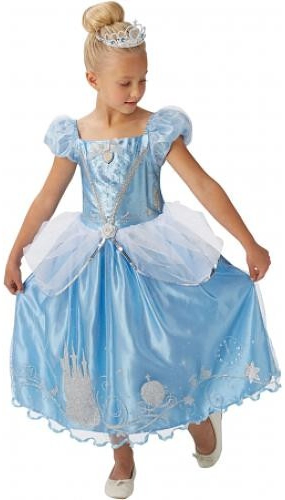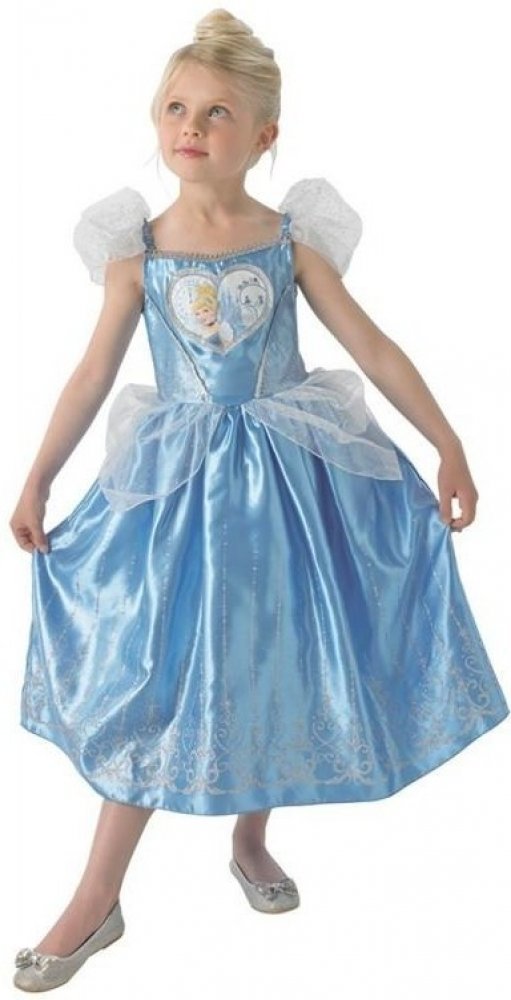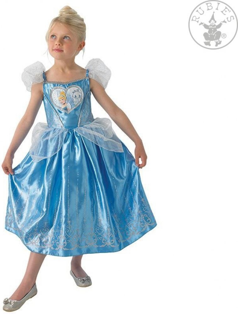 Popelčiny šaty v krásné modré barvě mají nadýchané bleděmodré rukávy, na hrudi je velký obrázek princezny Popelky a v jsou zdobeny stříbrnou mašličkou.