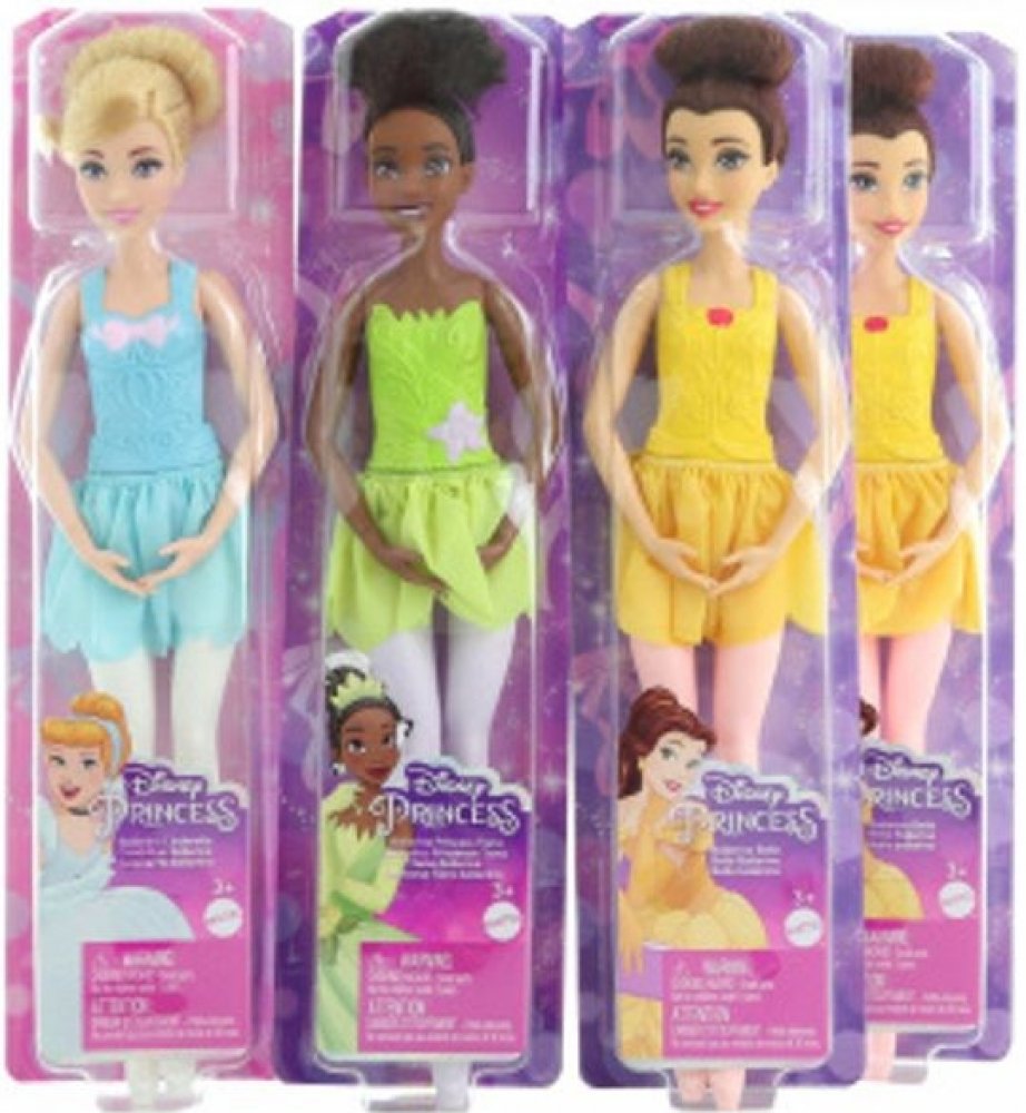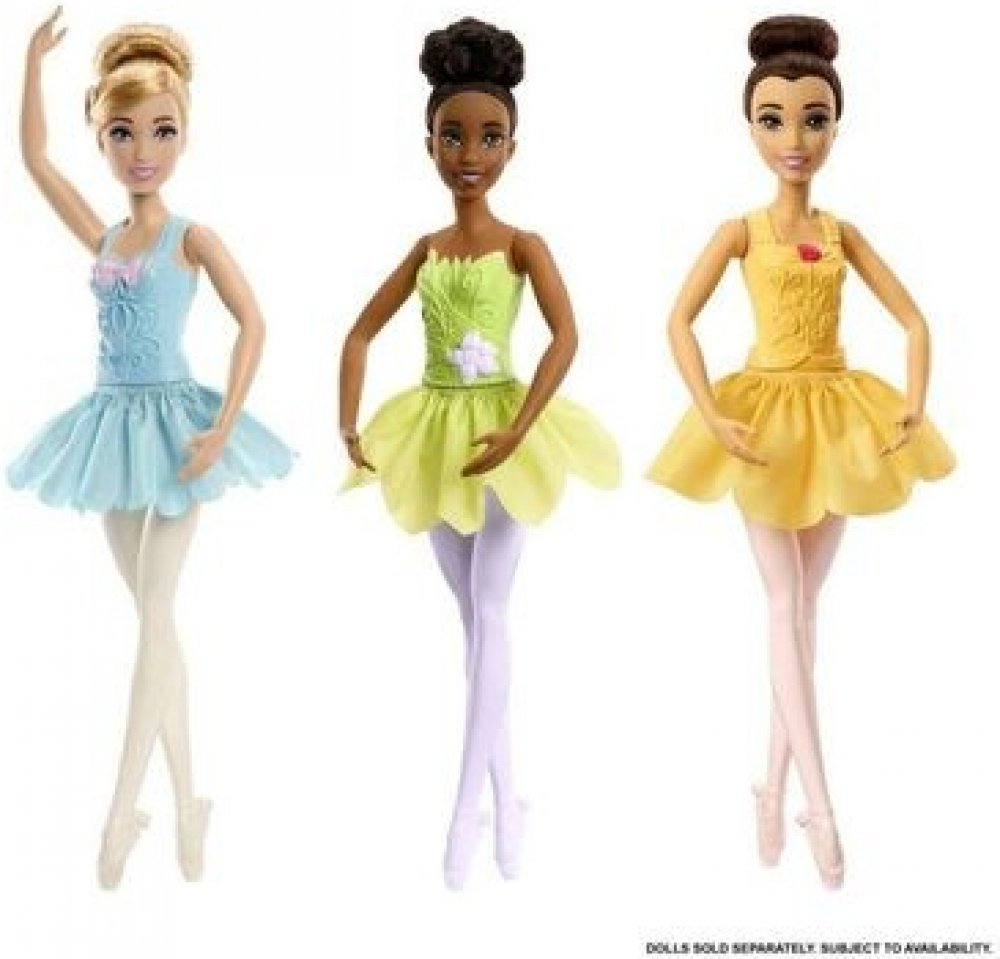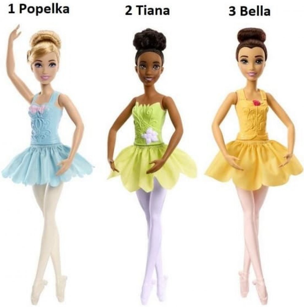 Tato panenka baletka Disney Princess přináší baletní princezny, jako jsou oblíbené Popelka, Bella a princezna Tiana. Každá panenka má upravené vlasy ve stylu baletky, točivou sukni a ruce a nohy v baletních pózách. Panenky se prodávají samostatně dle aktuální nabídky.Uvedená cena je za 1 kus.