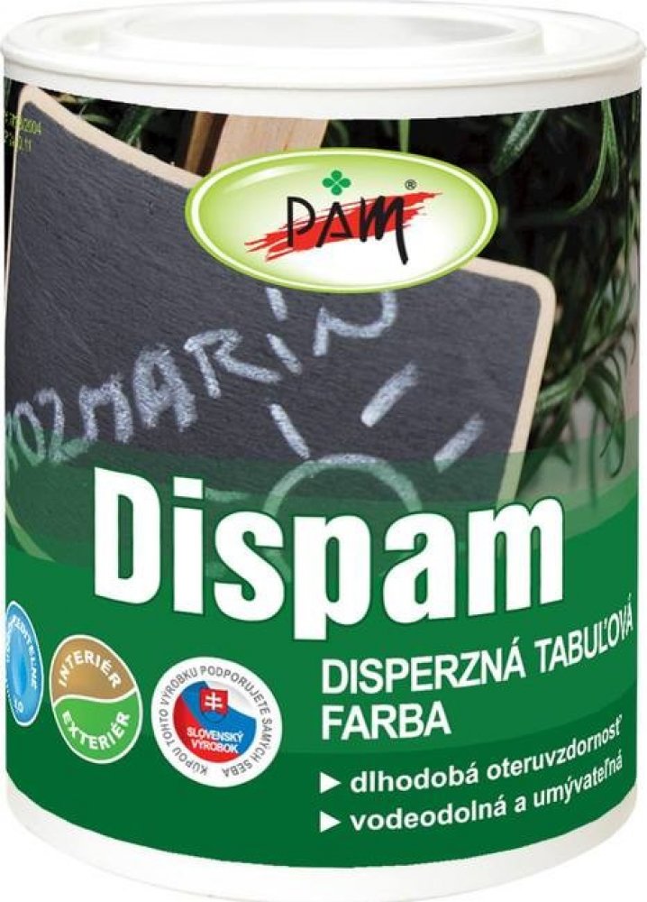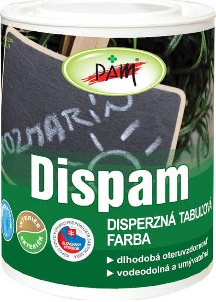 Nátěr Dispam tabulová barva je určen na povrchovou úpravu sololitových desek, školních tabulí, papírové lepenky, dřeva a zdí v interiéru a exteriéru. Nátěr je oděruvzdorný, odolný vůči vodě a má zlepšenou omyvatelnost. DISPAM tabulová barva není vhodný pro úpravu povrchů přicházejících do přímého styku s potravinami, pitnou vodou, na nátěry dětských hraček a dětského nábytku. Mechanické zatížení školních tabulí doporučujeme po 24 hodinách. Před aplikací DISPAM tabulové barvy doporučujeme dřevo ošetřit impregnačním prostředkem.
