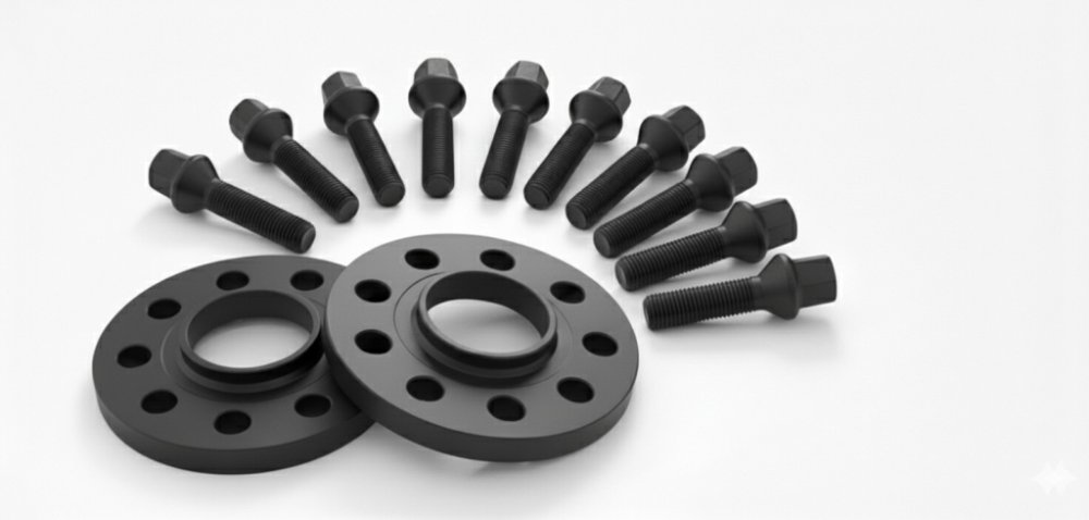 Sada obsahuje: 2 černé distanční prvky a 10 černých šroubů M14x1.25x40mm Kužel Klíč 17.