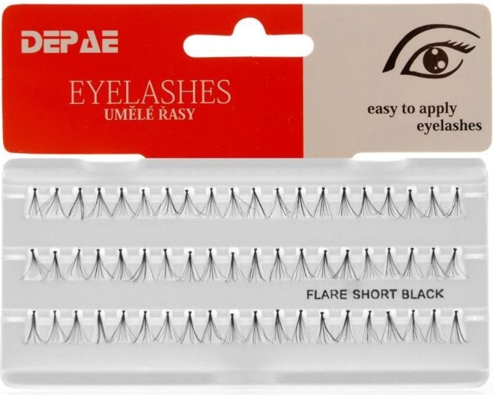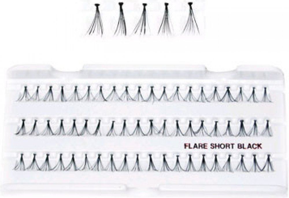 Nalepovací umělé řasy Flare Short (krátké). Černé, 60 trsů. Umělé řasy jsou kosmetický doplněk používající se pro zvýraznění přírodních očních řas a to z důvodu zvětšení jejich tloušťky, délky a plnosti. Řasy můžete zastřihnout dle velikosti svého oka.Použití Naneste tenkou vrstvu lepidla na základní část umělé řasy. Vyčkejte asi 30 sekund a v tomto mezičase vytvarujte řasu do podkovy. Lépe pak přilne k víčku. Přilepte řasu k víčku a jemnými dotyky přitlačujte řasu k víčku až do uschnutí lepidla. Při odstraňování umělé řasy jemně odlepujte ve směru od venkovního koutku oka k vnitřnímu.