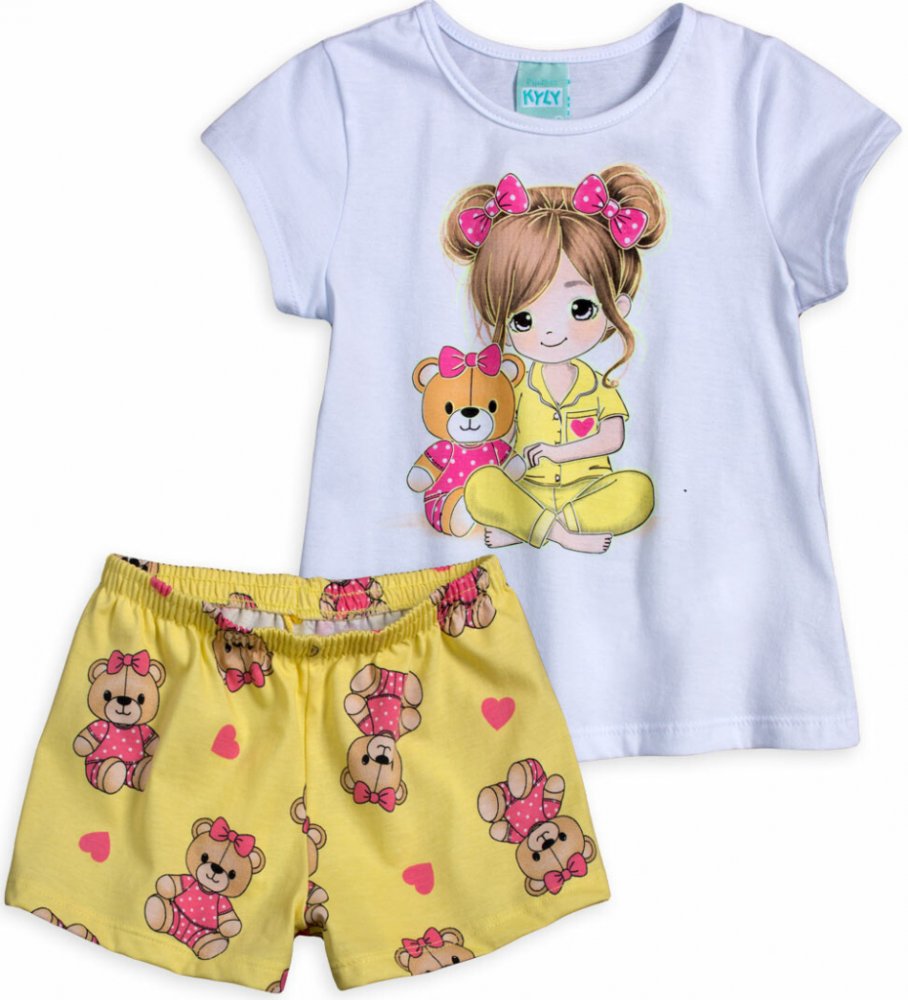 Pro noci plné něhy a kouzelných snů! Dívčí pyžamo Kyly je čistá roztomilost a pohodlí. Je ušité z jednolícní 100% bavlny, takže je lehké, prodyšné a ideální pro příjemné, hřejivé spaní. Tričko zdobí okouzlující potisk holčičky s medvídkem, doplněný srdíčky a magi...